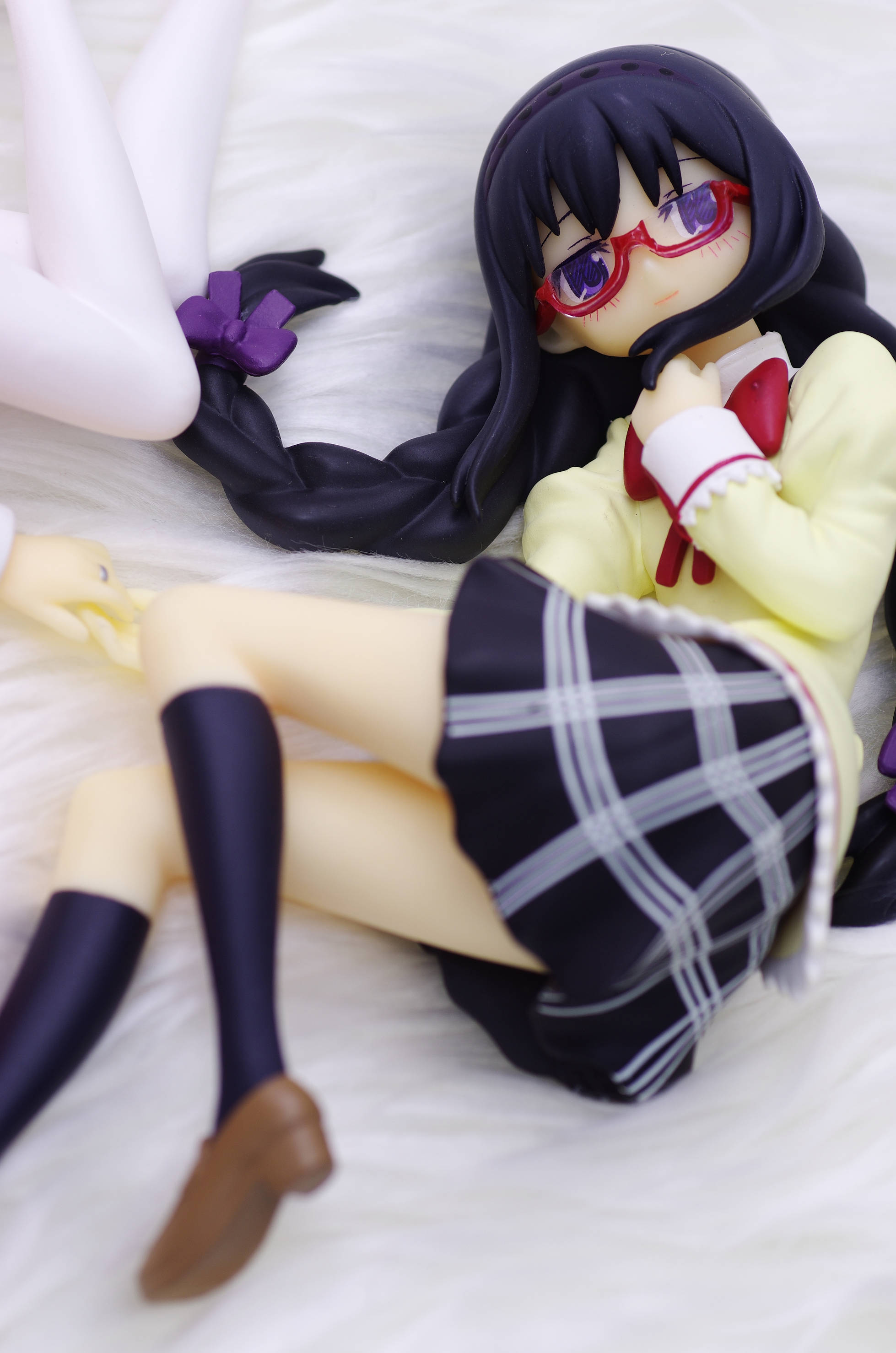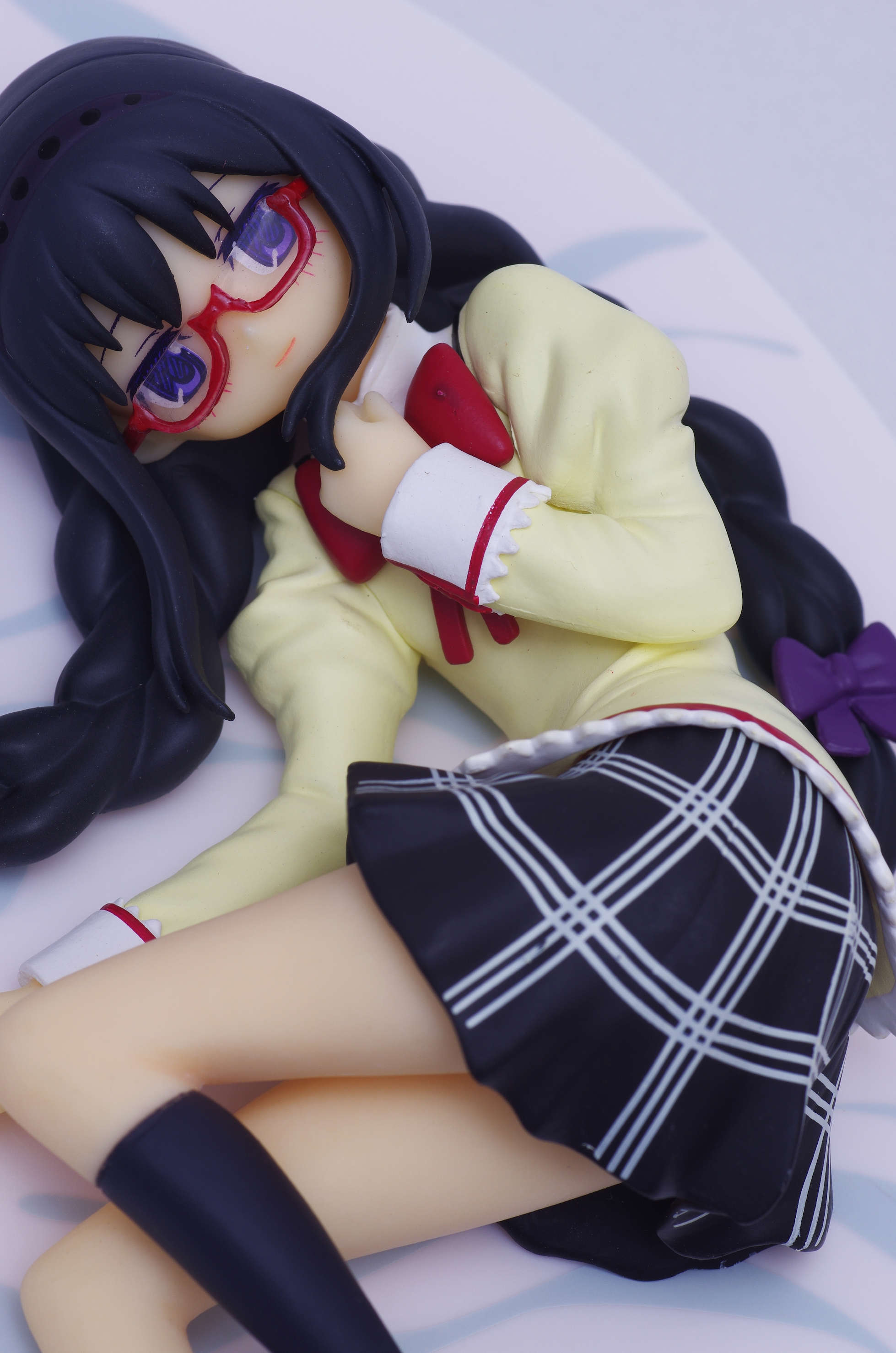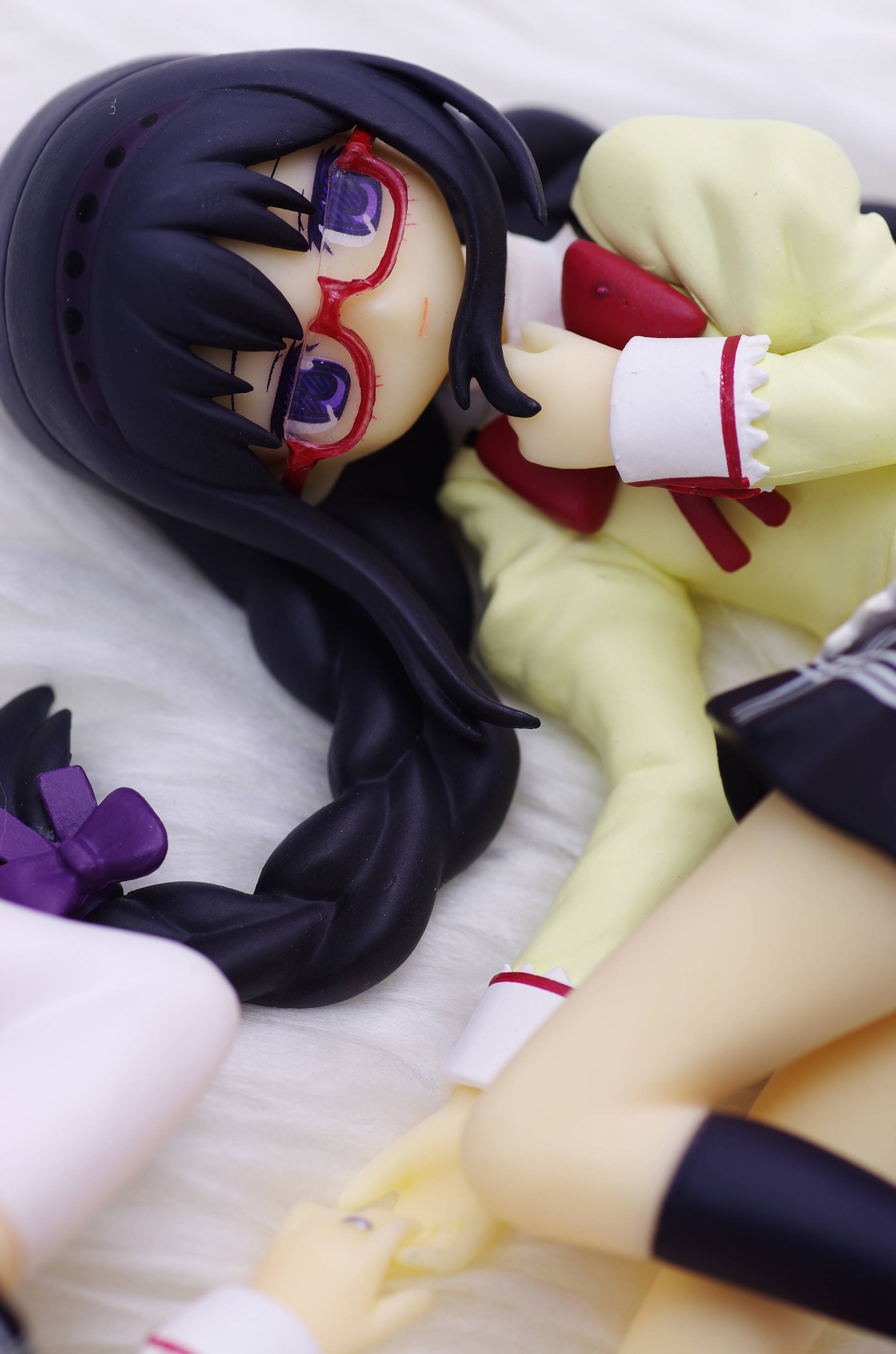 制服姿で寝ころんだポーズのほむほむ♪胸元に当てた手があざと可愛いくて良いですな(まどっちと並べてキマシ❤)