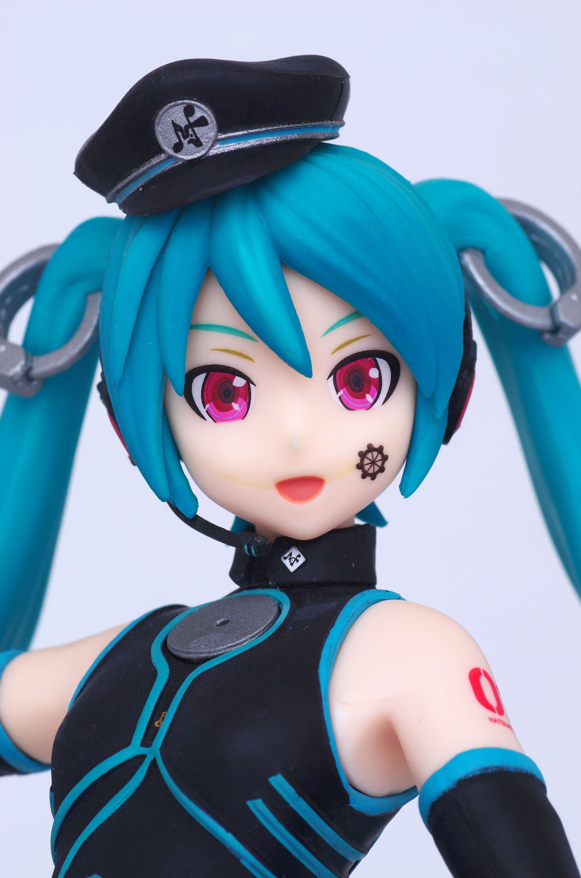 看守風な帽子を頭に乗せ髪留めが手錠になったツインテ(ボリューム感たっぷりなツインテには支柱も)