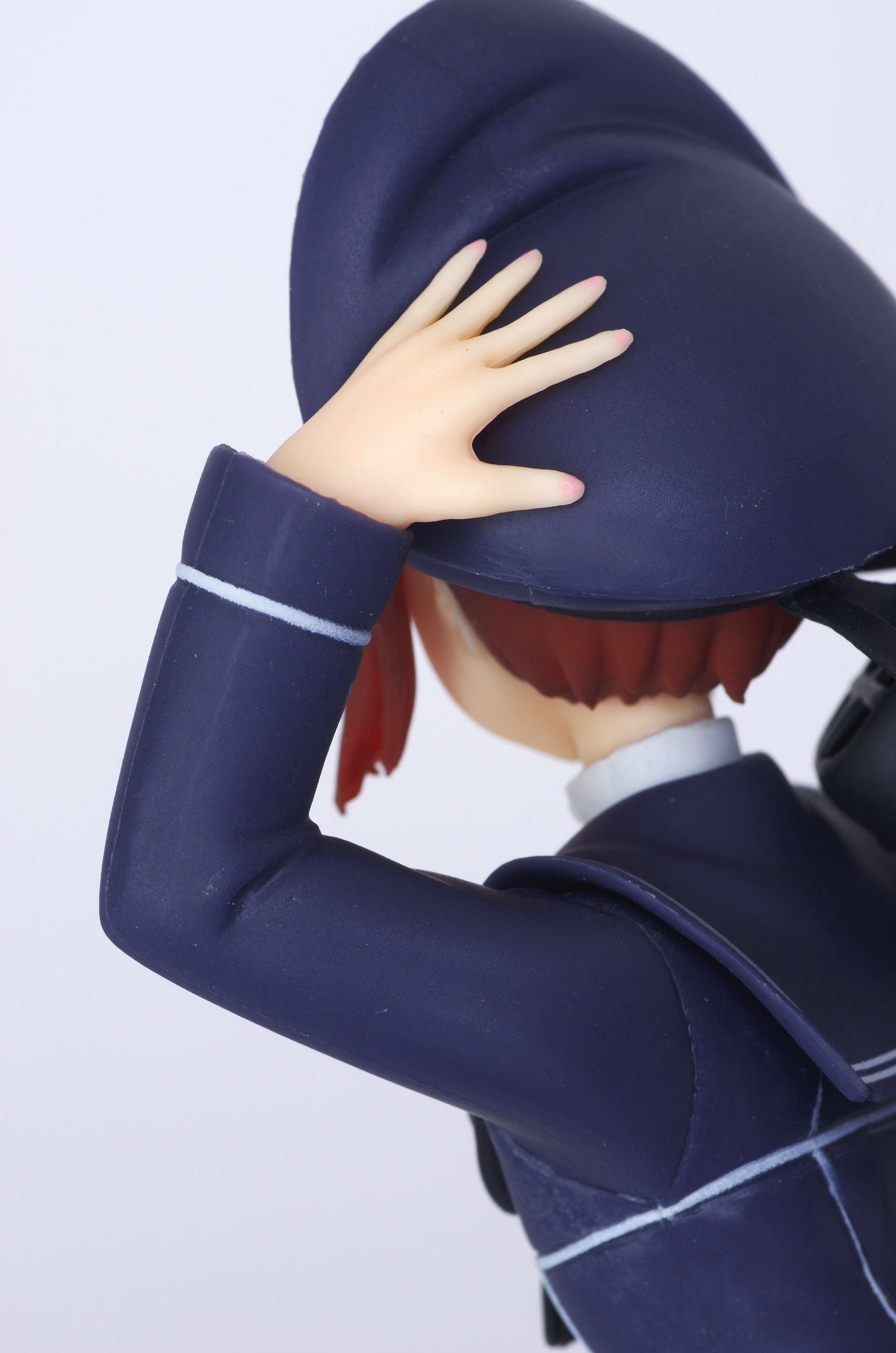 帽子を押さえる左手(爪の塗装もしっかり)