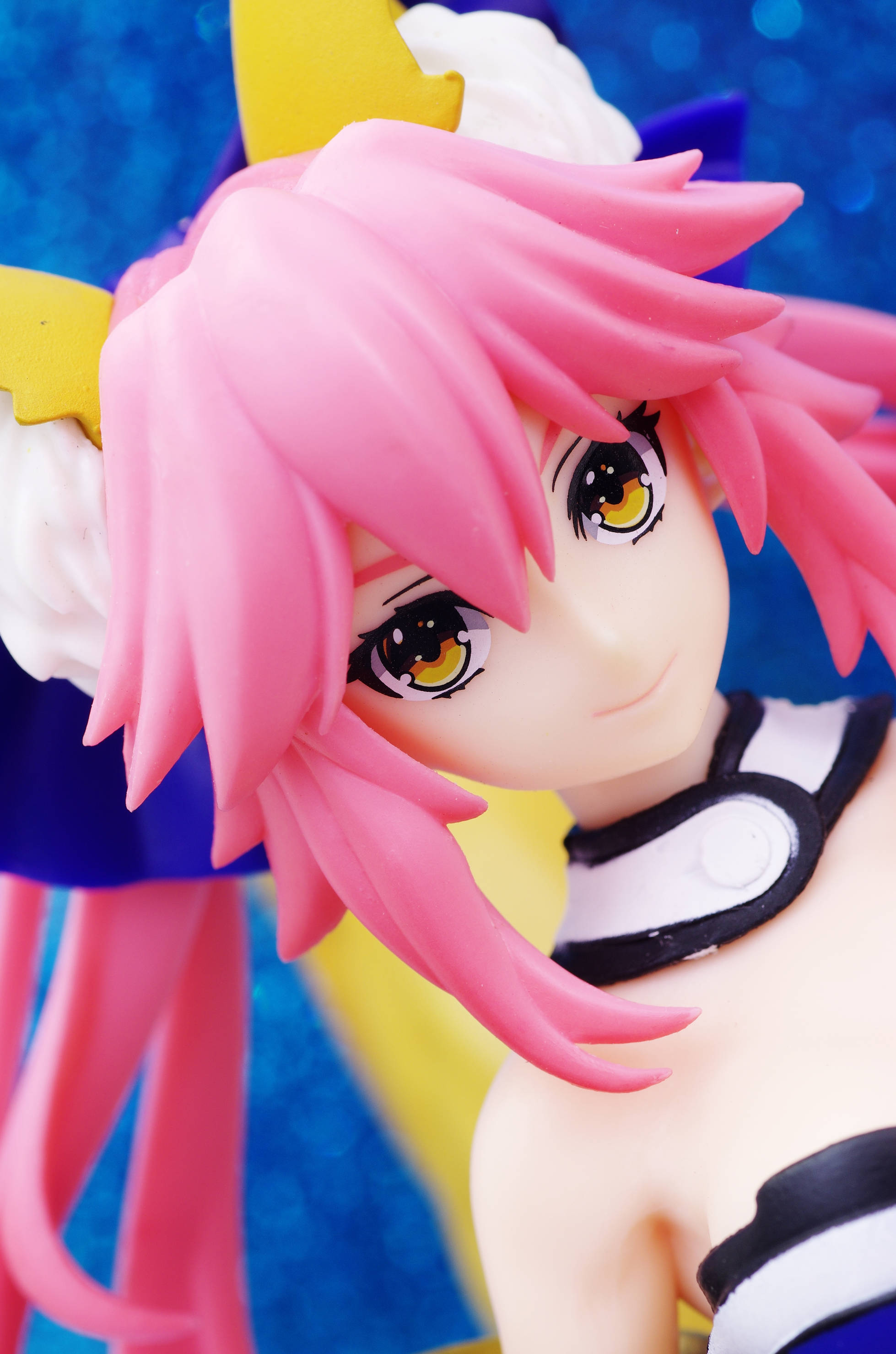 大きな青いリボンで留められたピンクの髪(キツネのお耳がピョン)