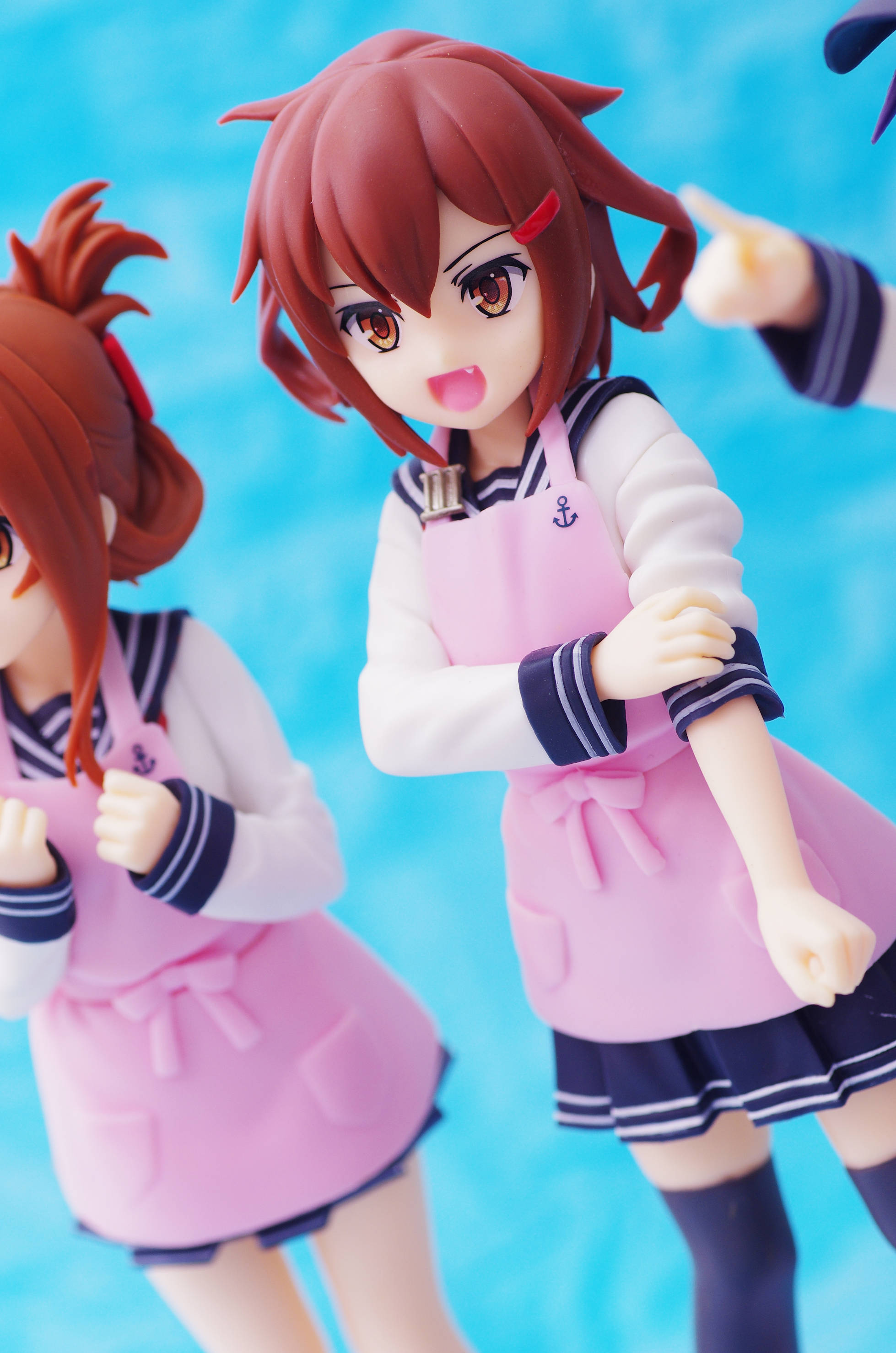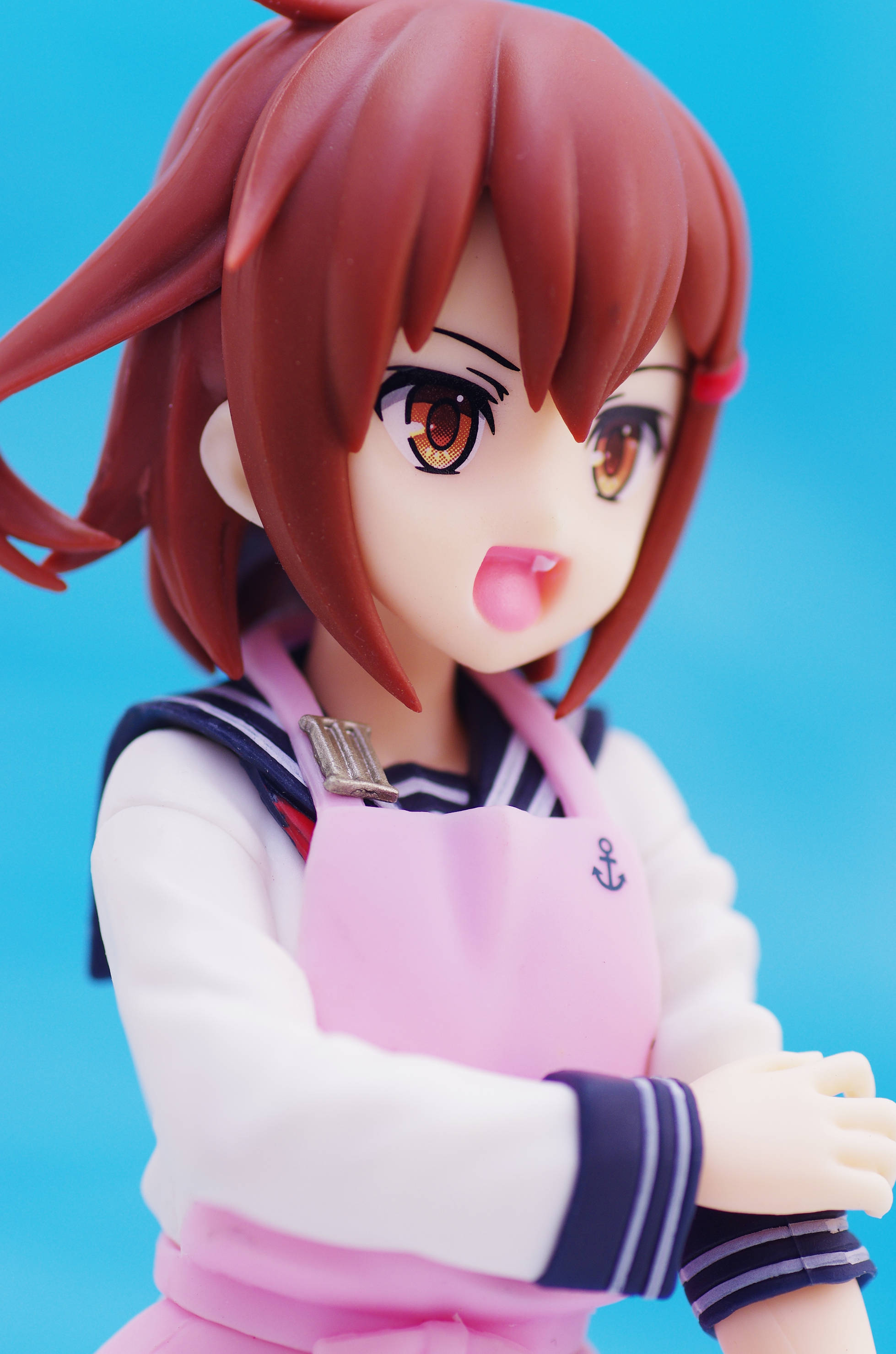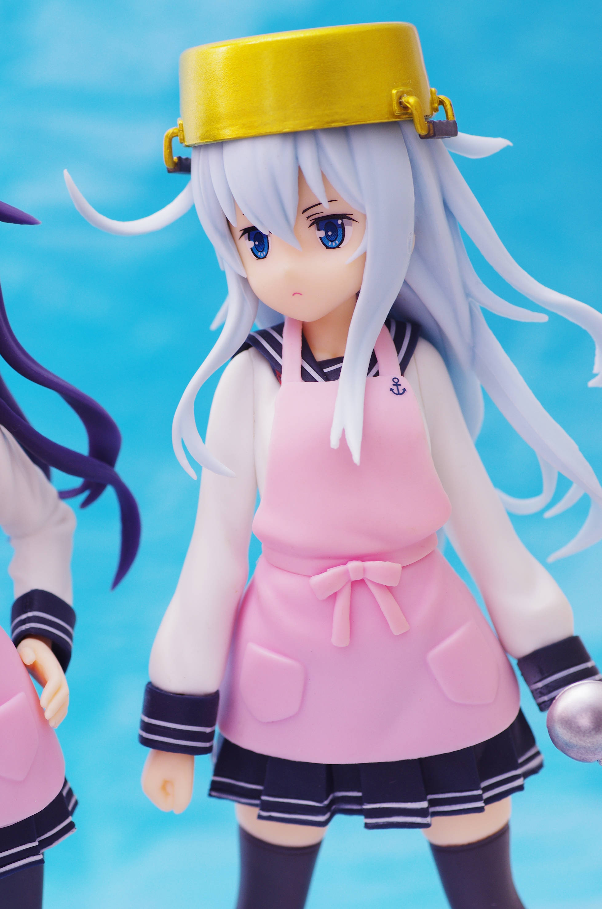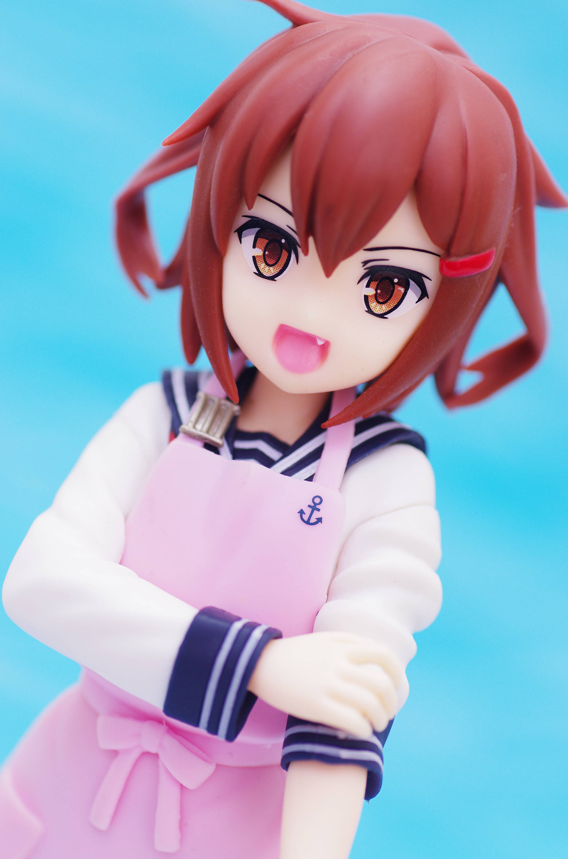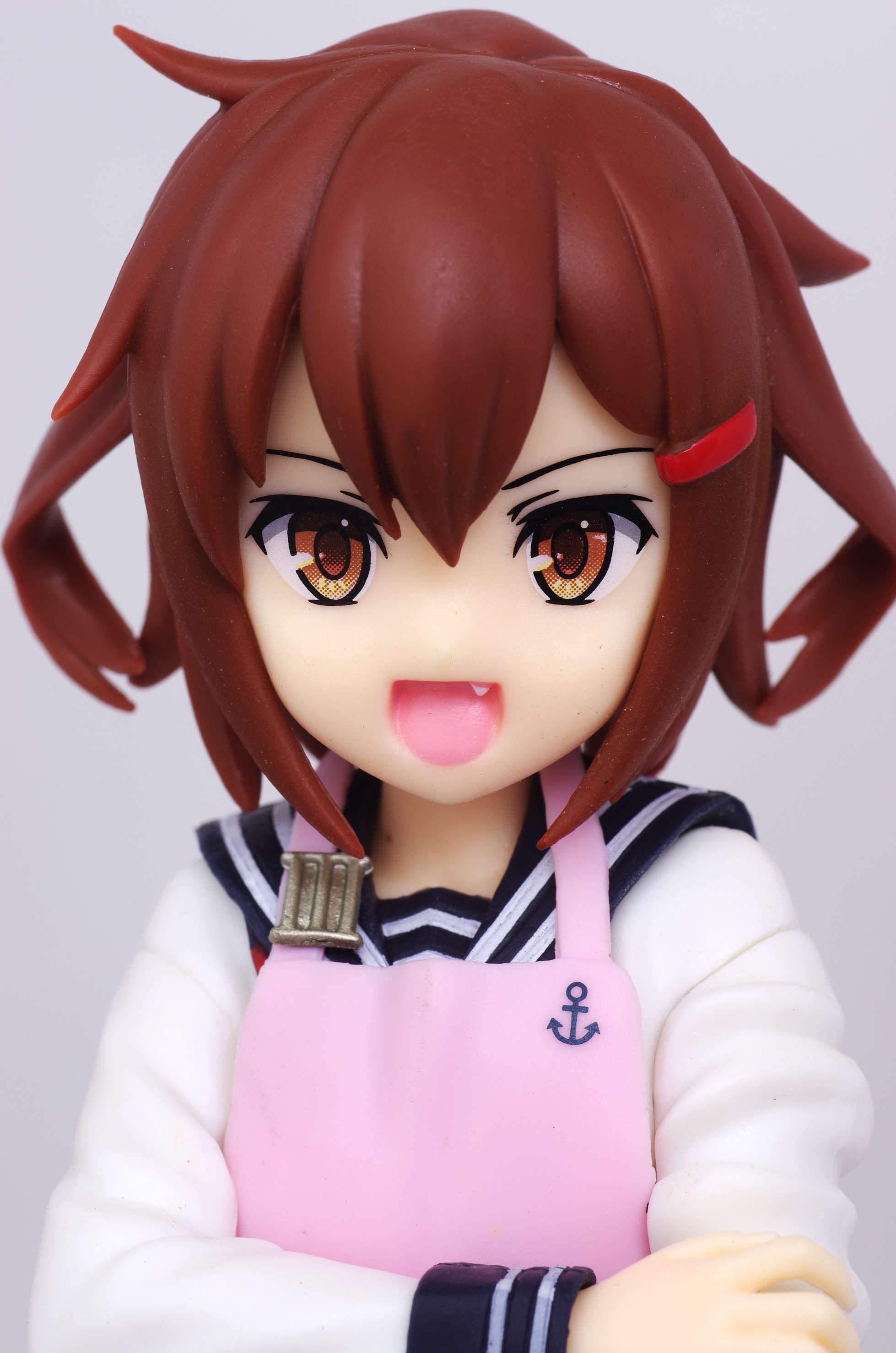 セーラー服の上からかけたピンク色のエプロン(肩口には特Ⅲ型のバッジ)