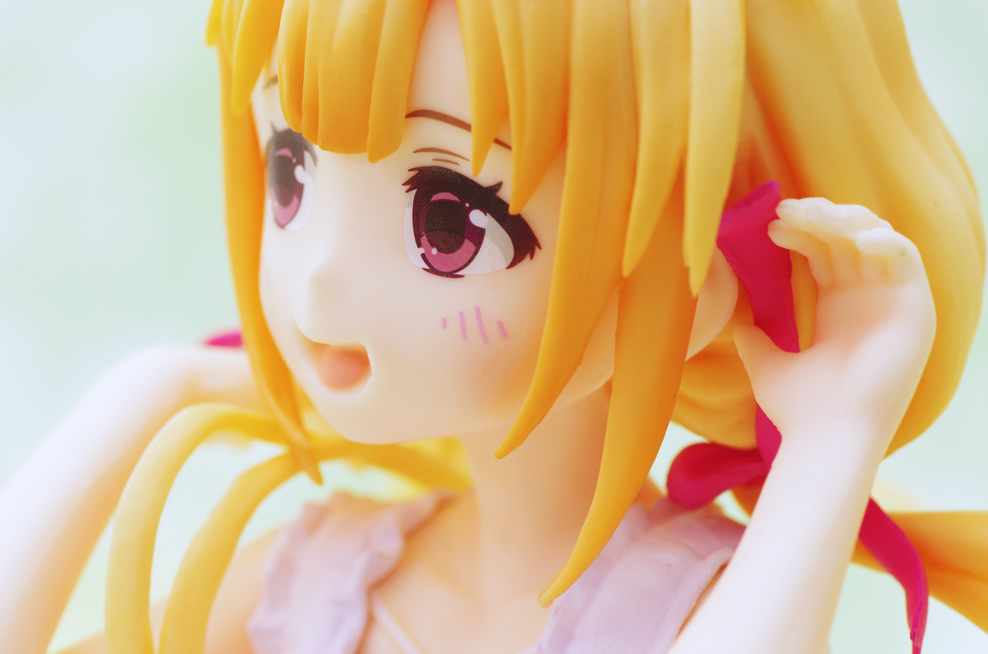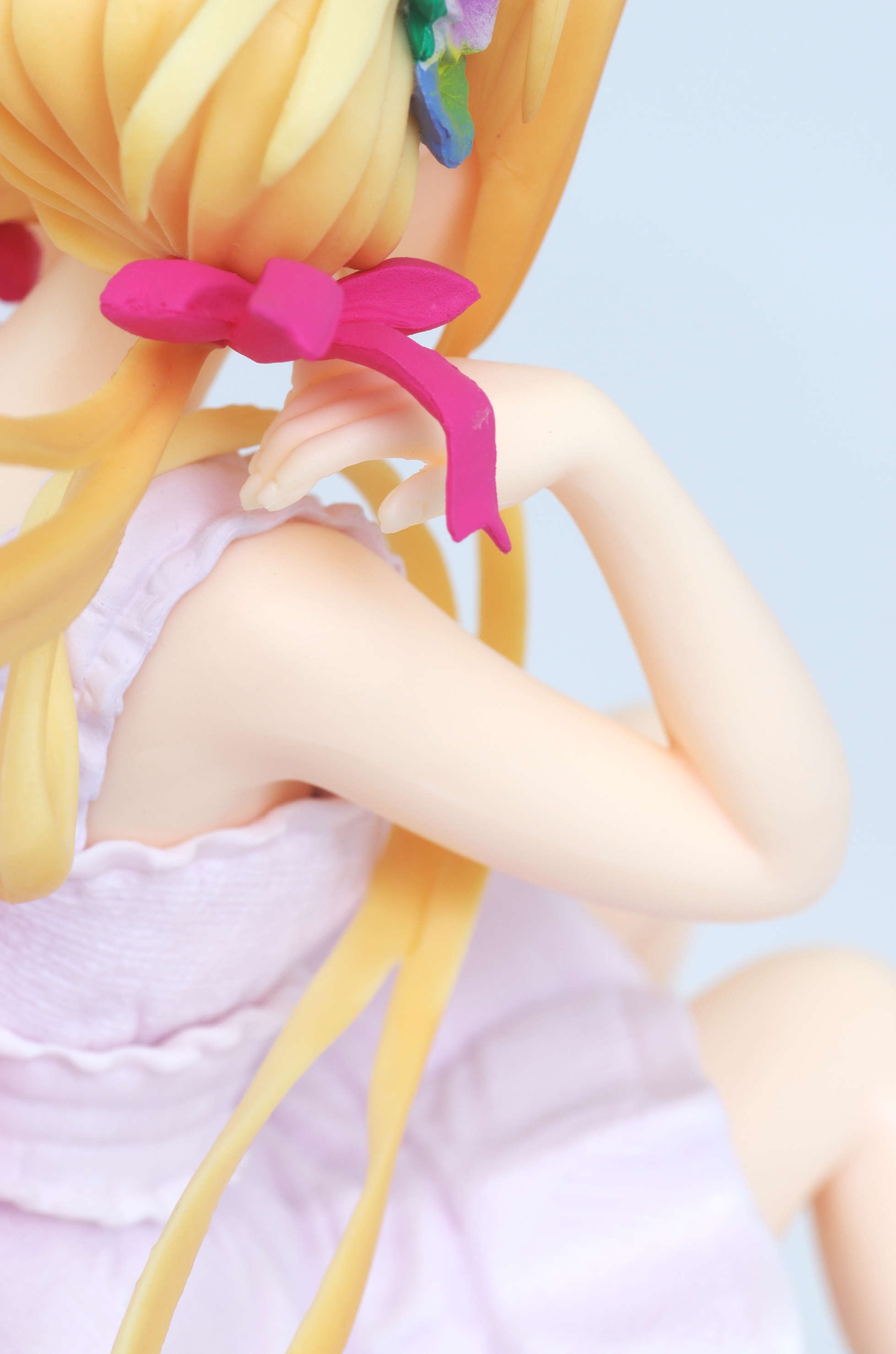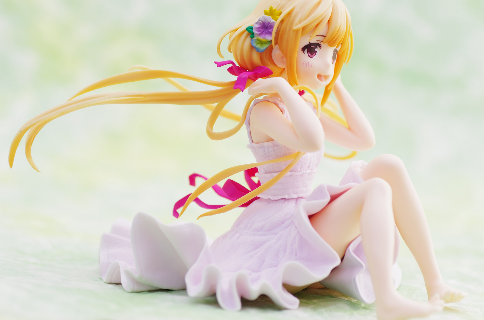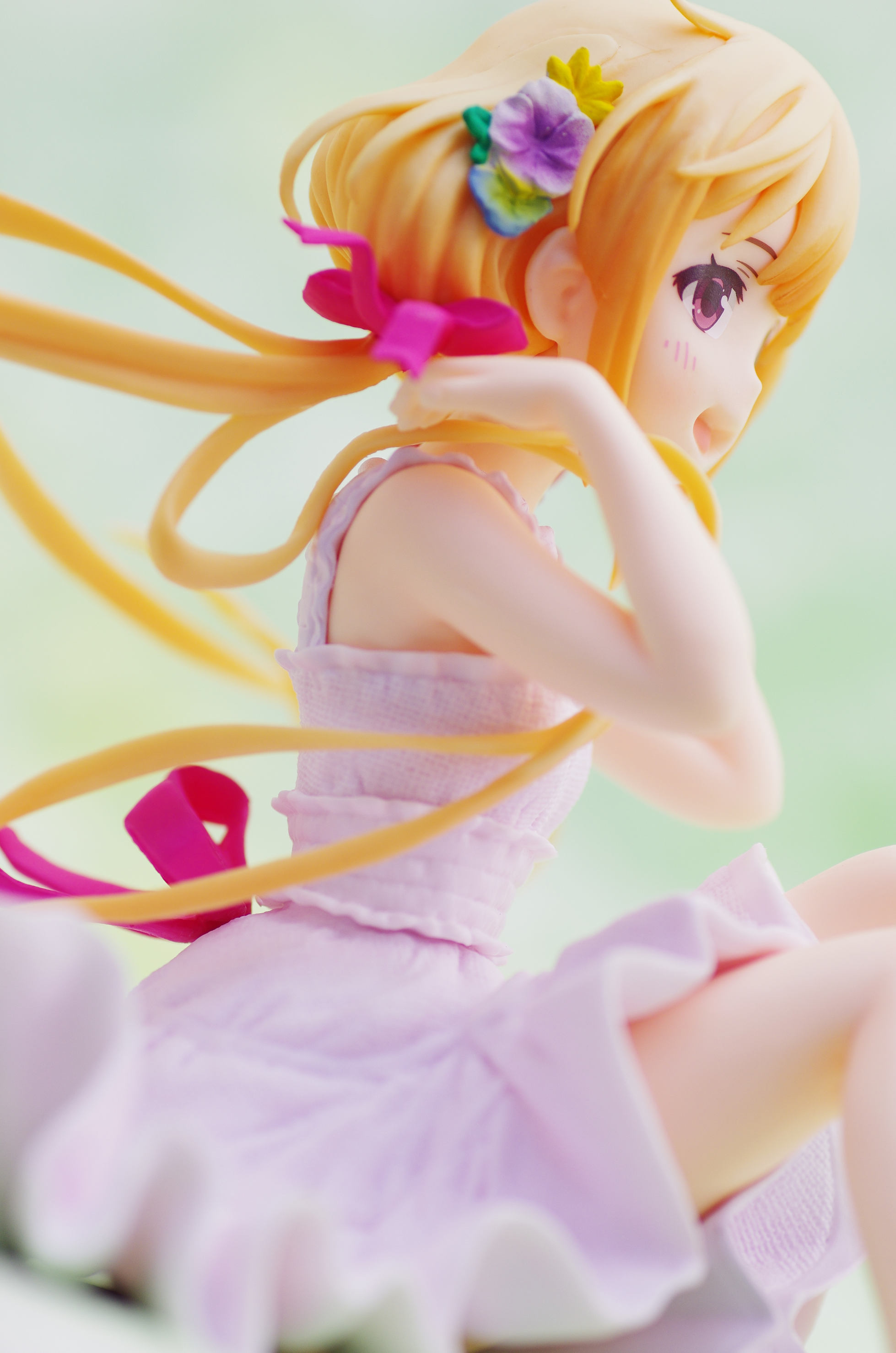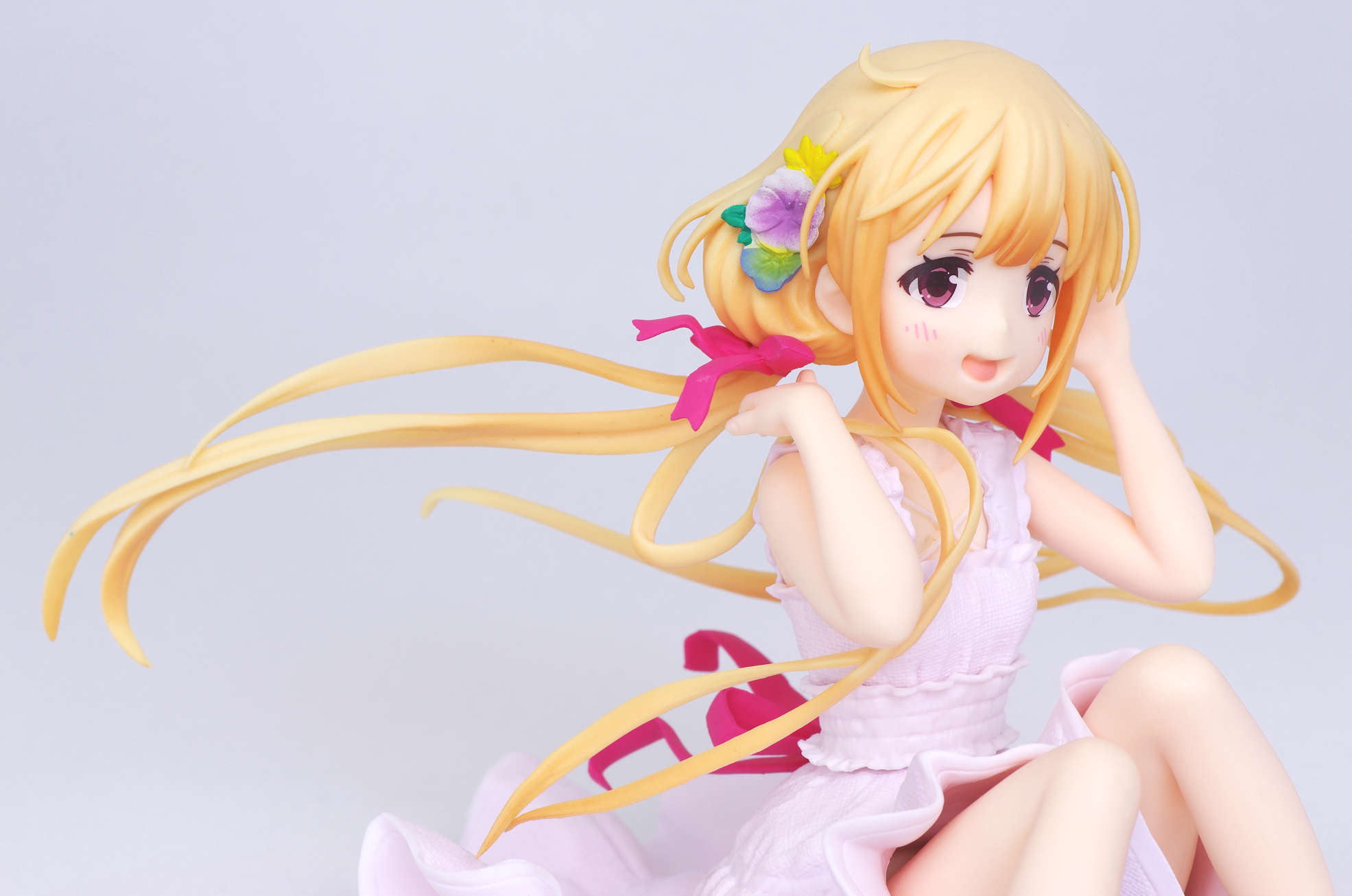 風になびく様子が立体的に表現された金髪(赤いリボンや花の髪飾りがポイント高し)