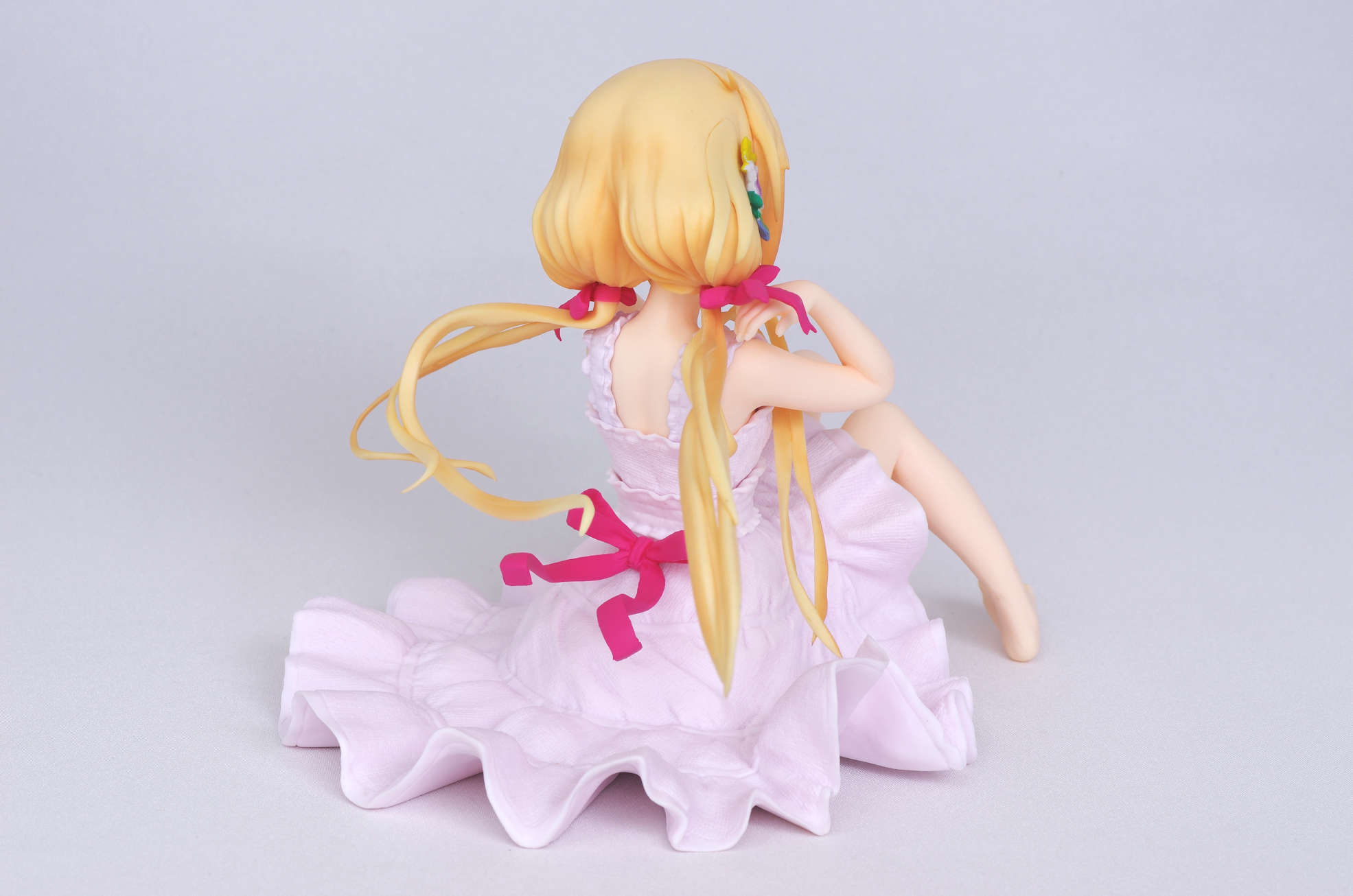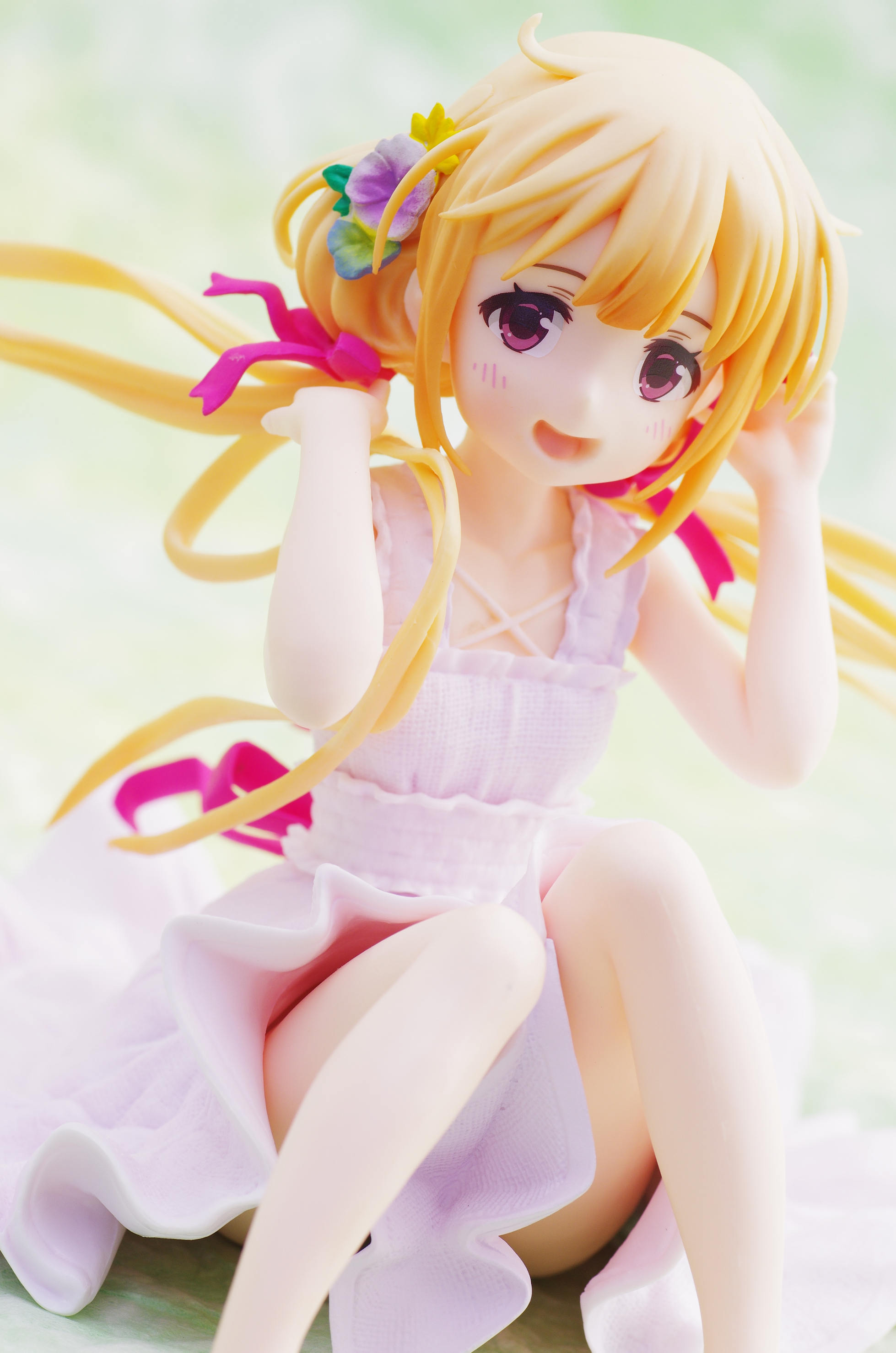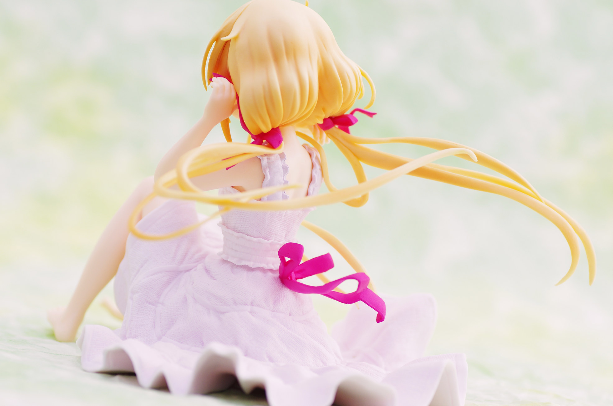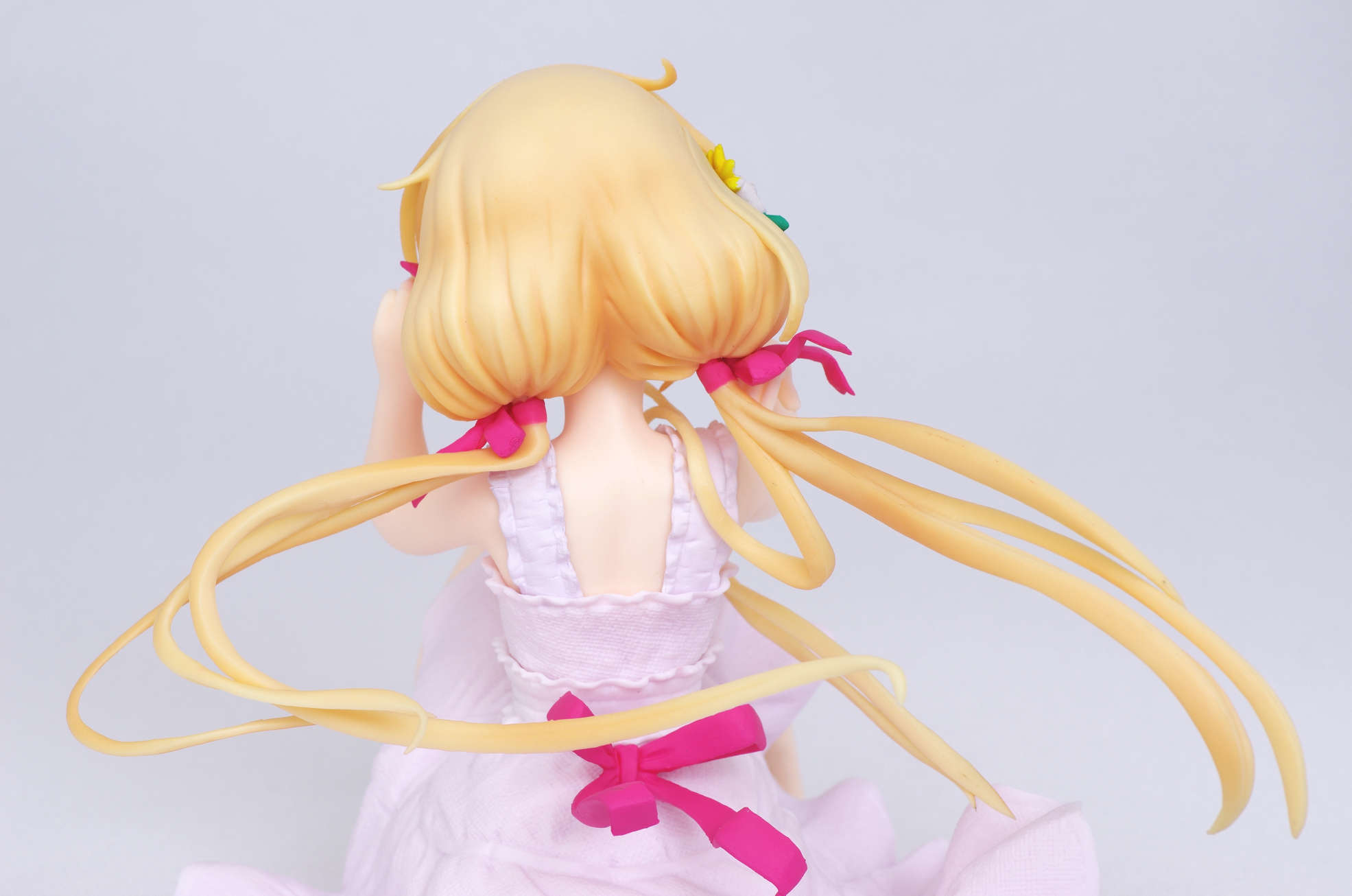 風になびく様子が立体的に表現された金髪(赤いリボンや花の髪飾りがポイント高し)