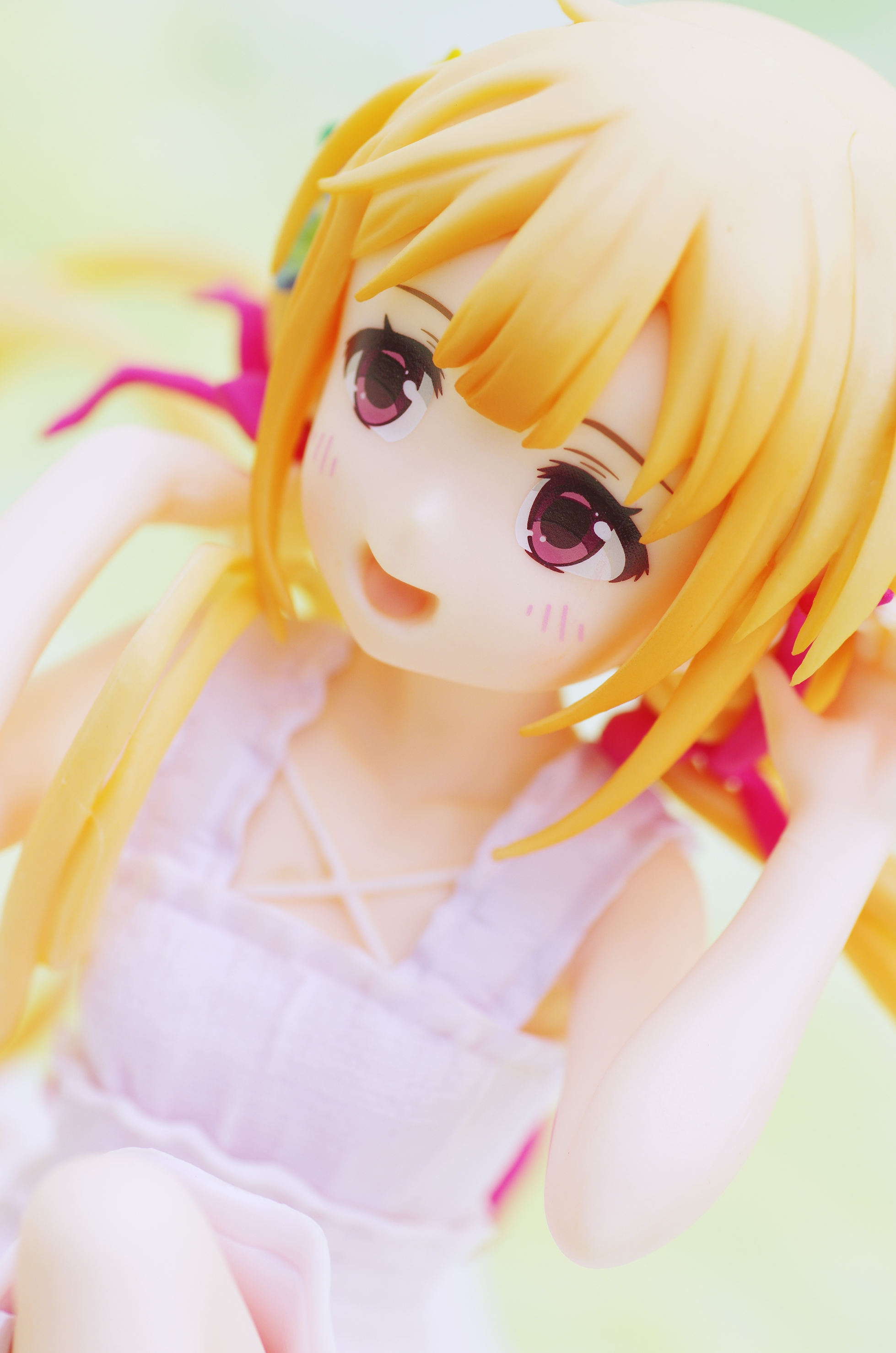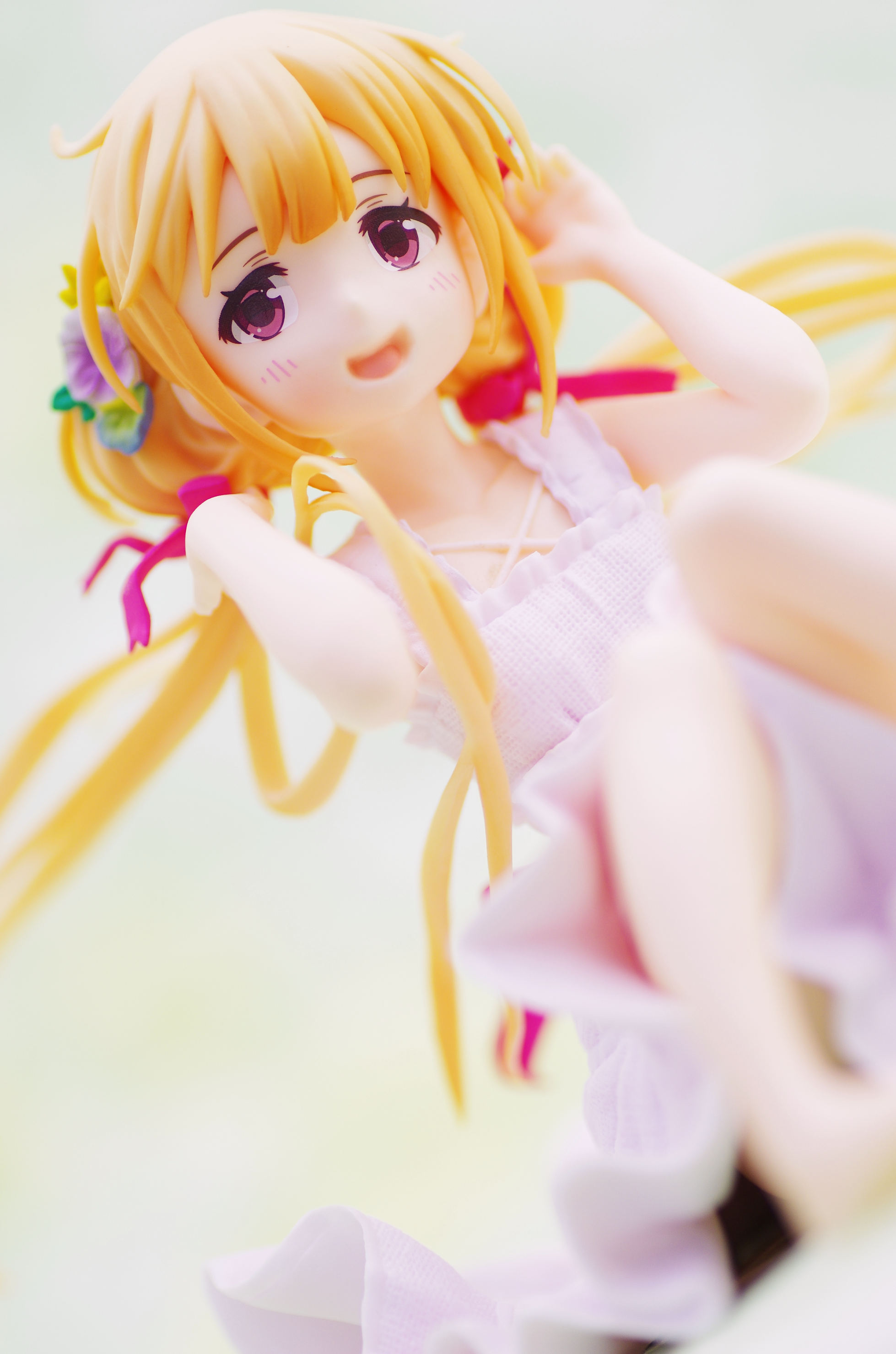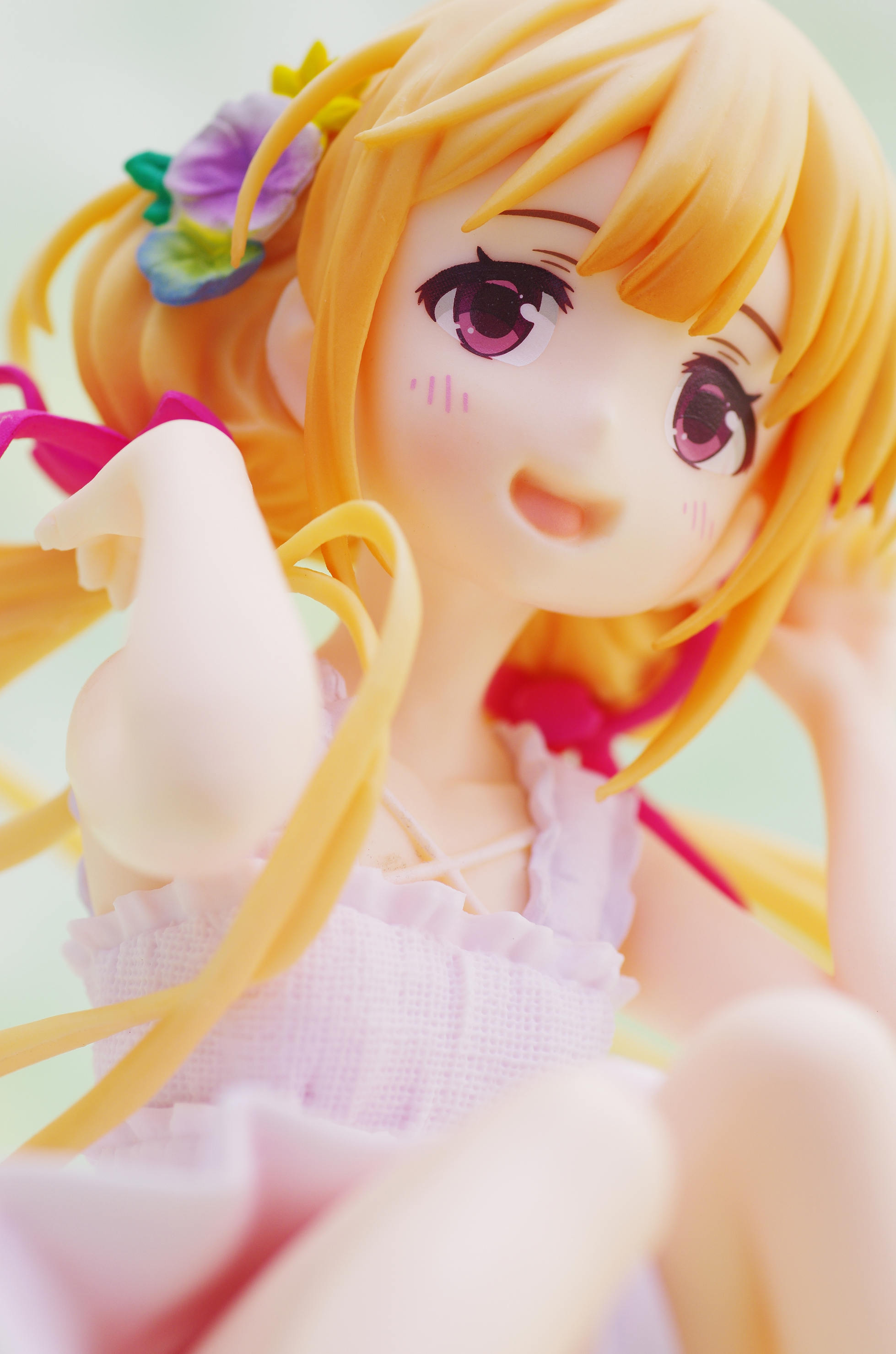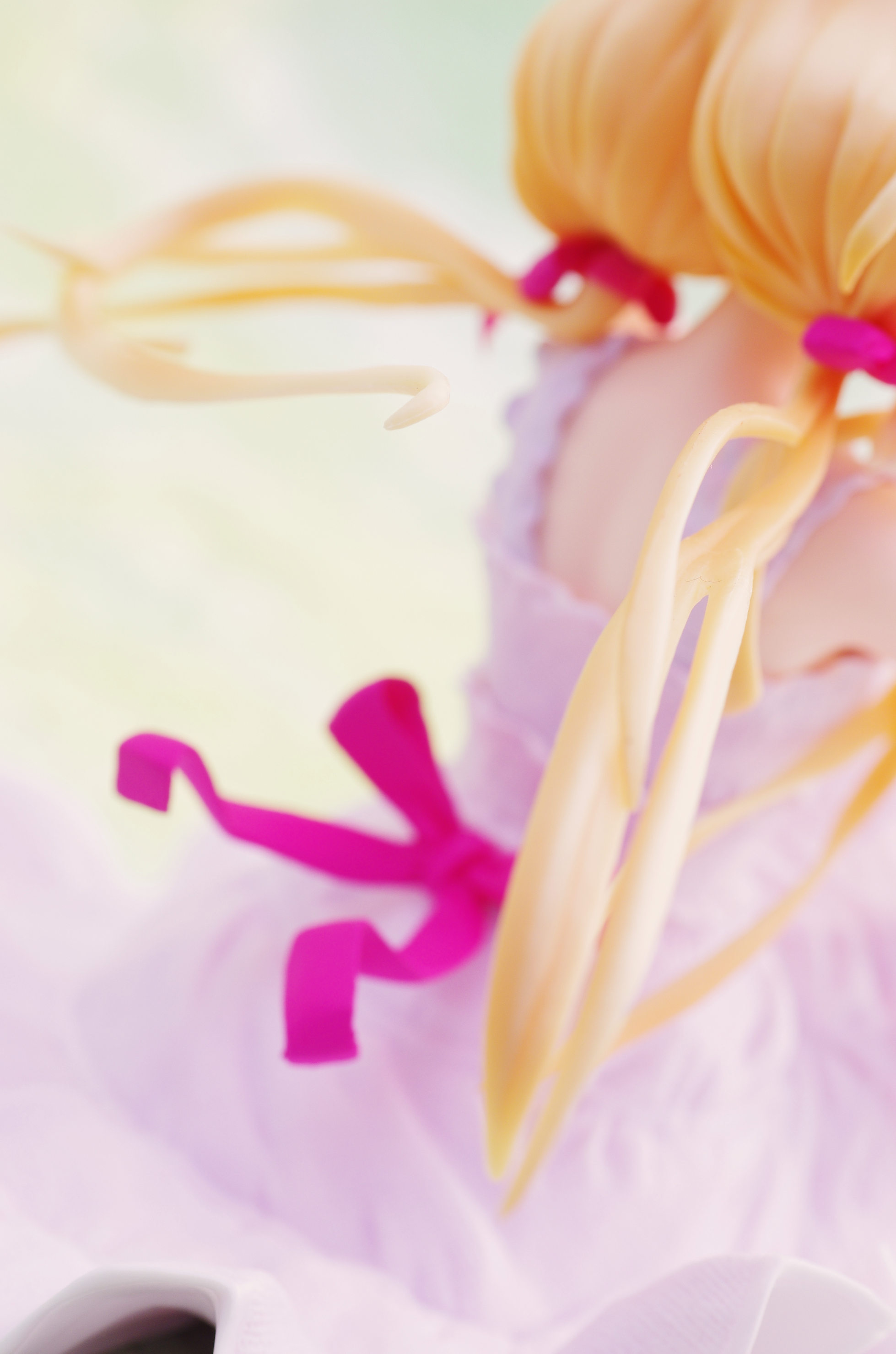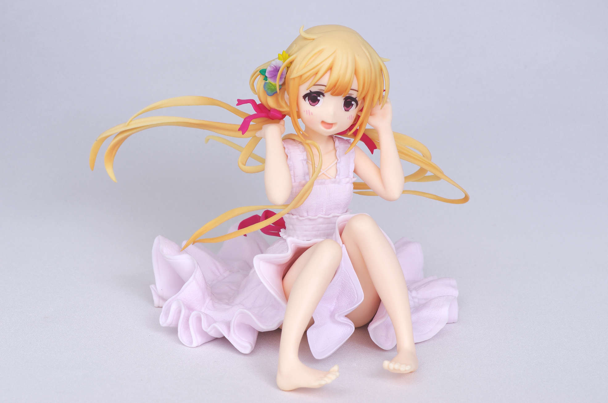 風になびく様子が立体的に表現された金髪(赤いリボンや花の髪飾りがポイント高し)