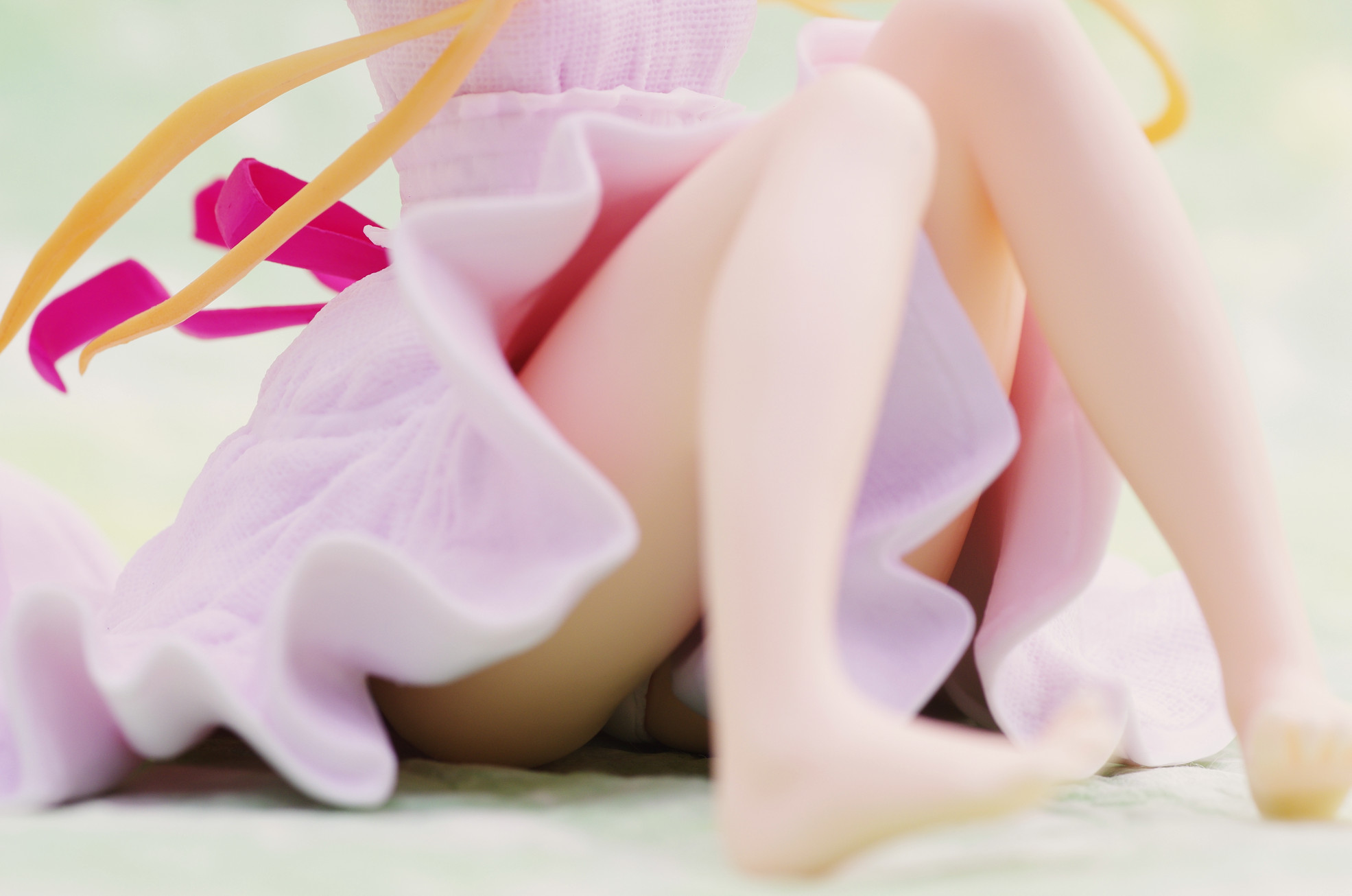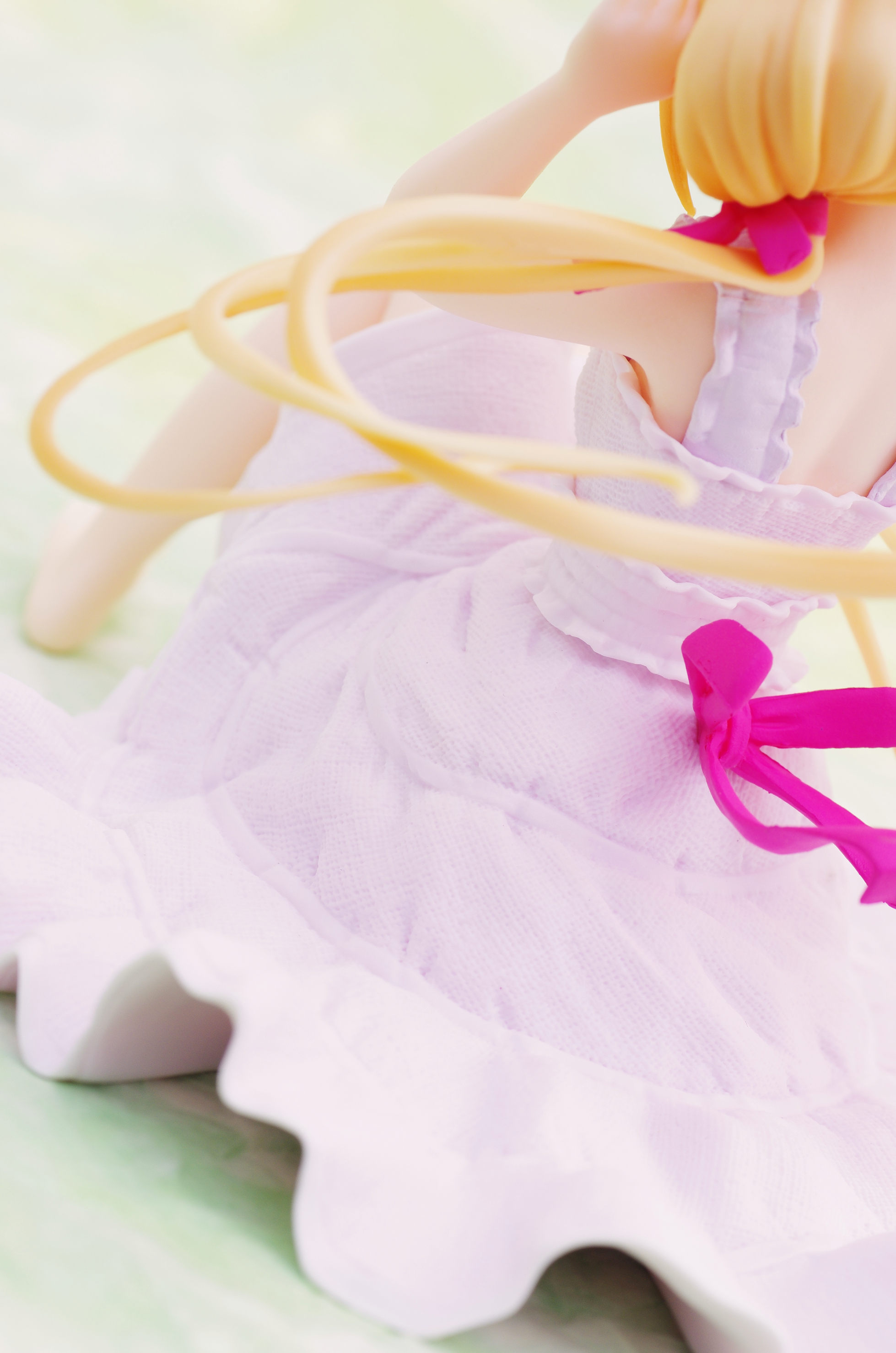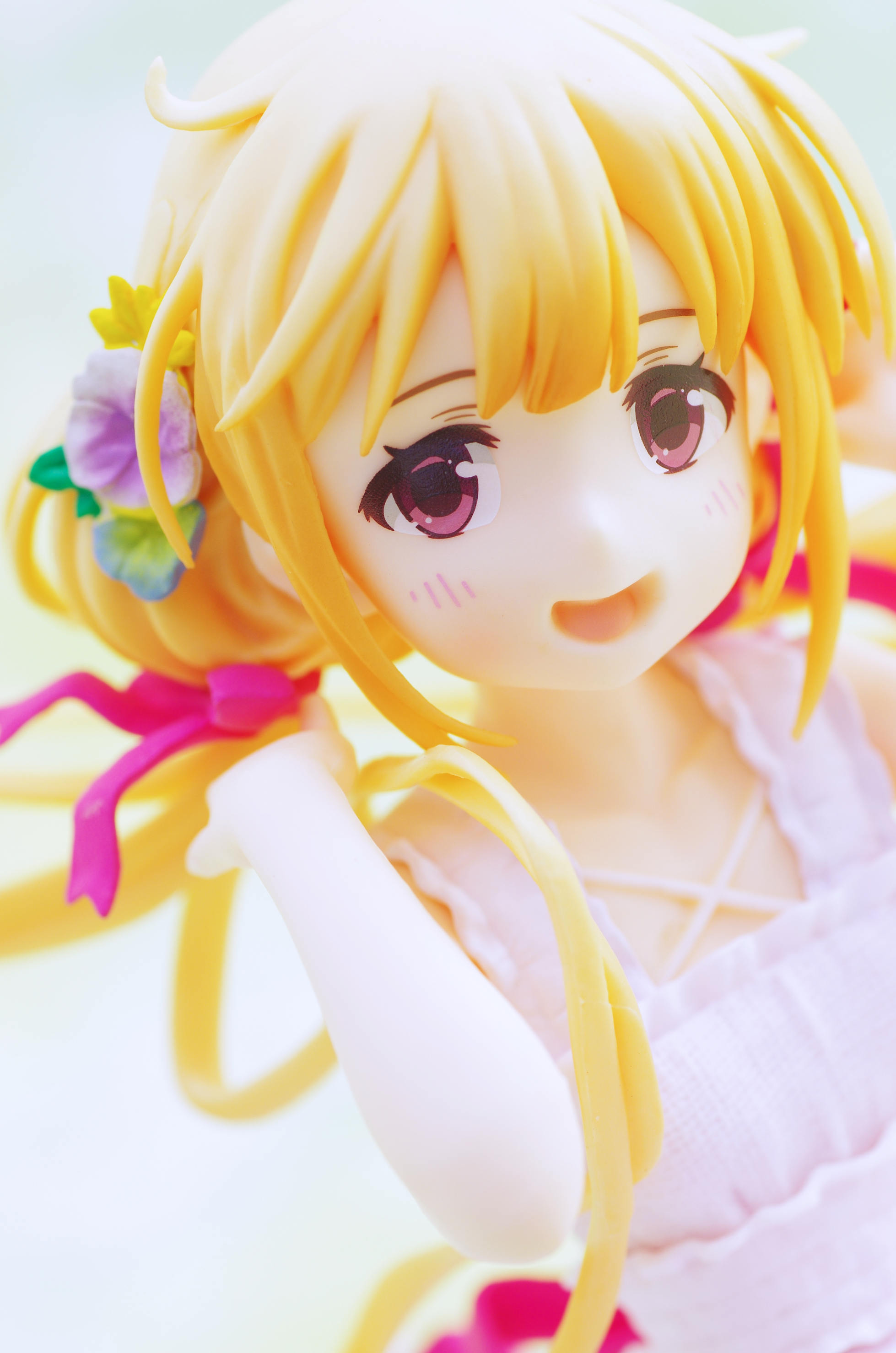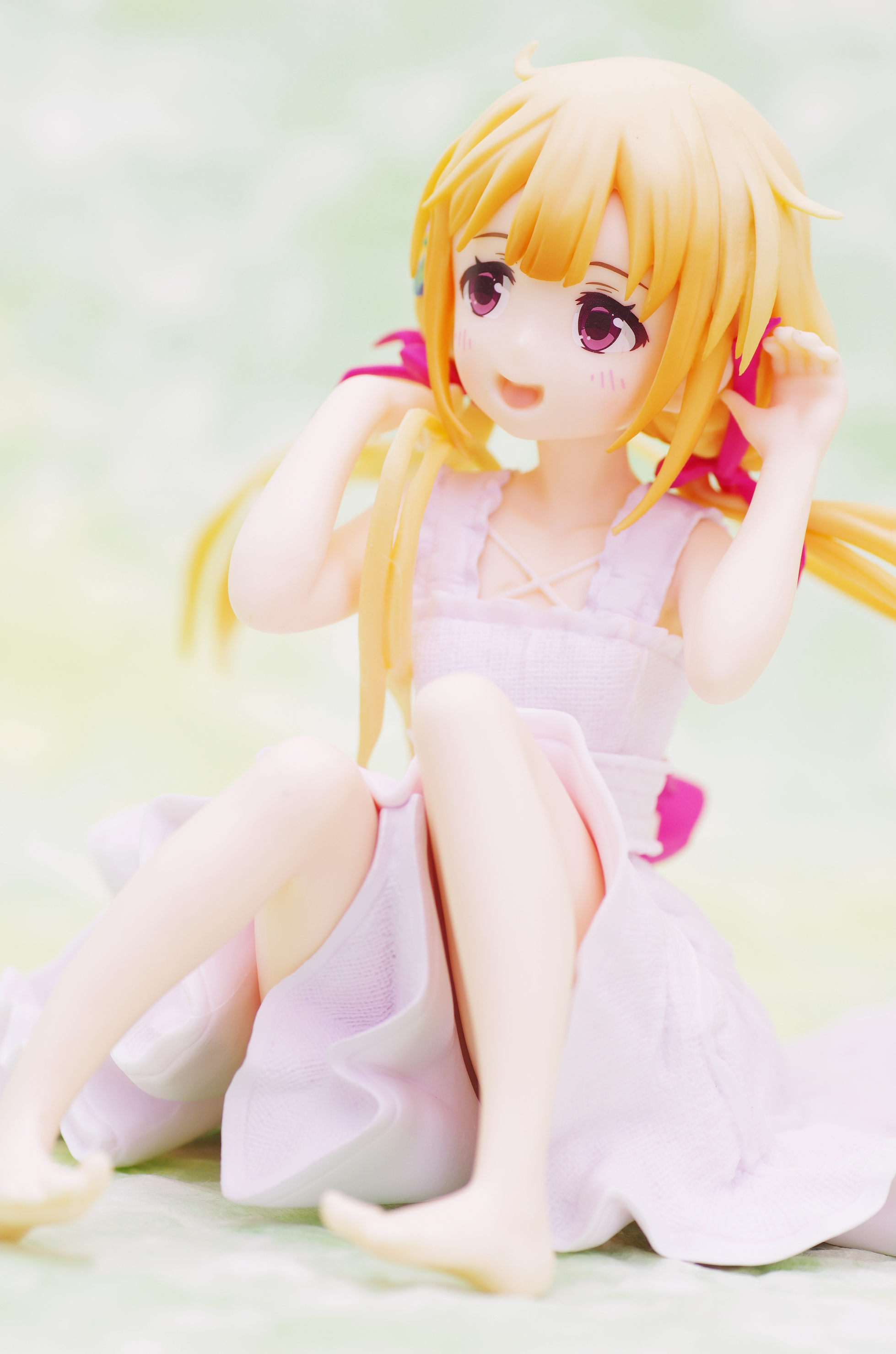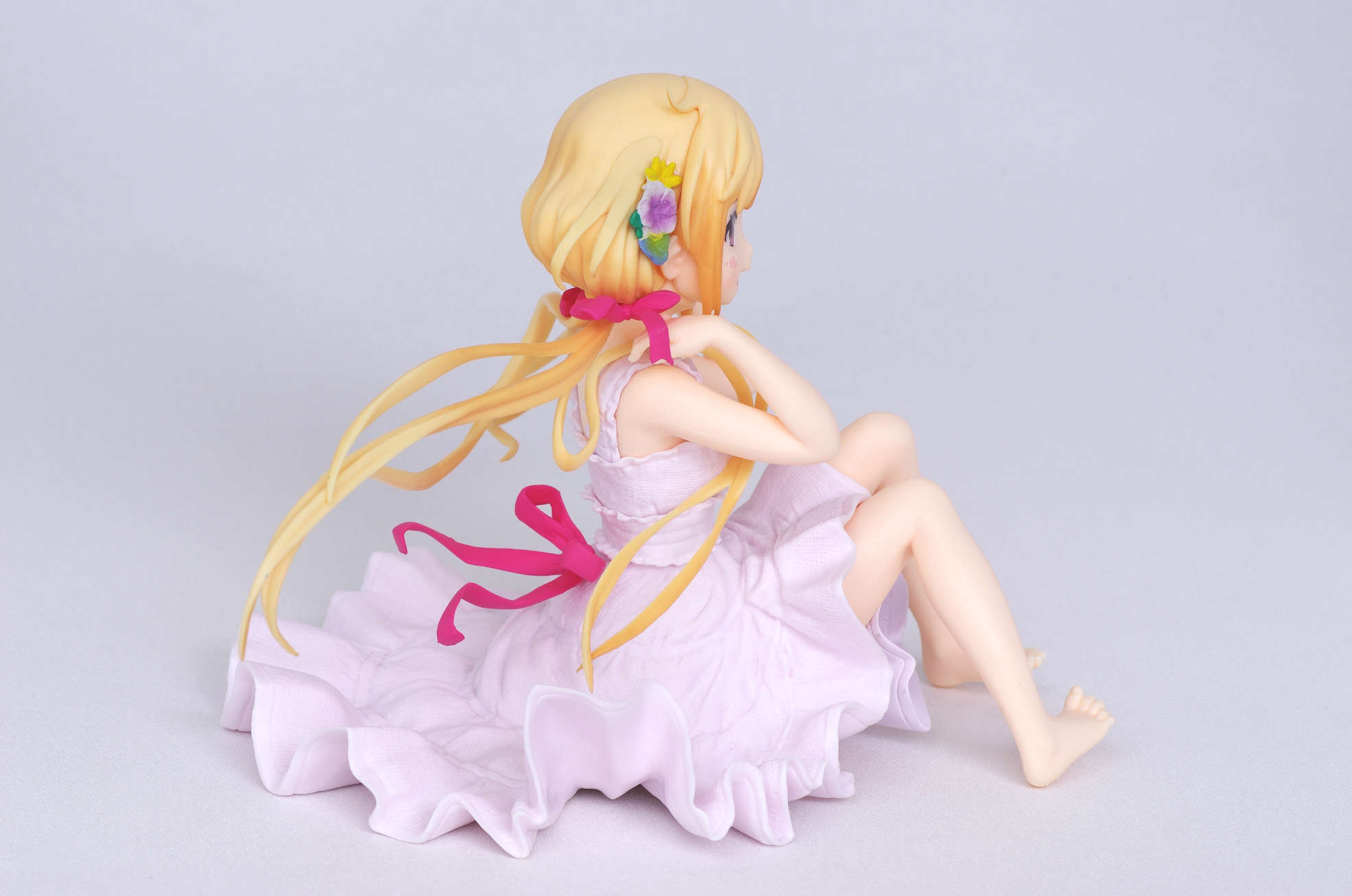 風になびく様子が立体的に表現された金髪(赤いリボンや花の髪飾りがポイント高し)