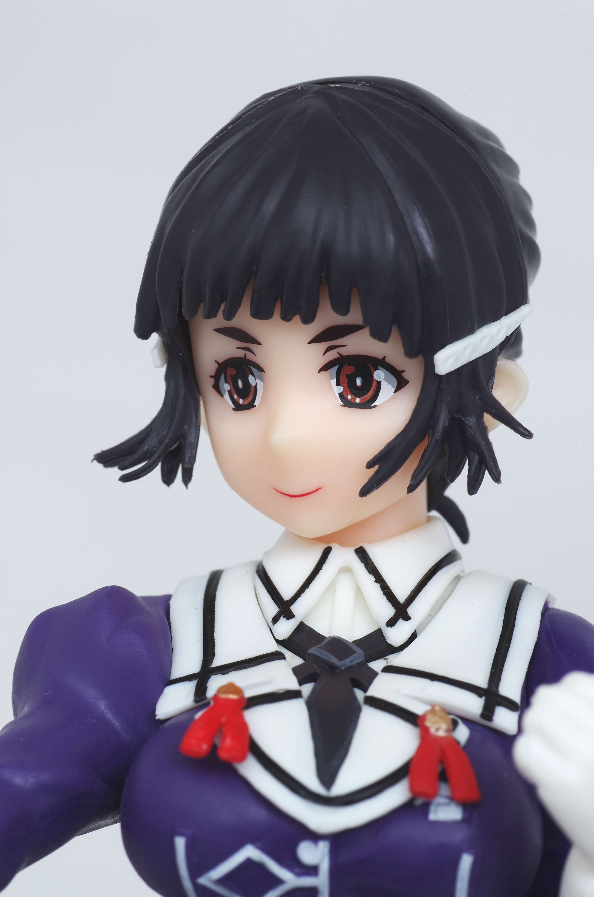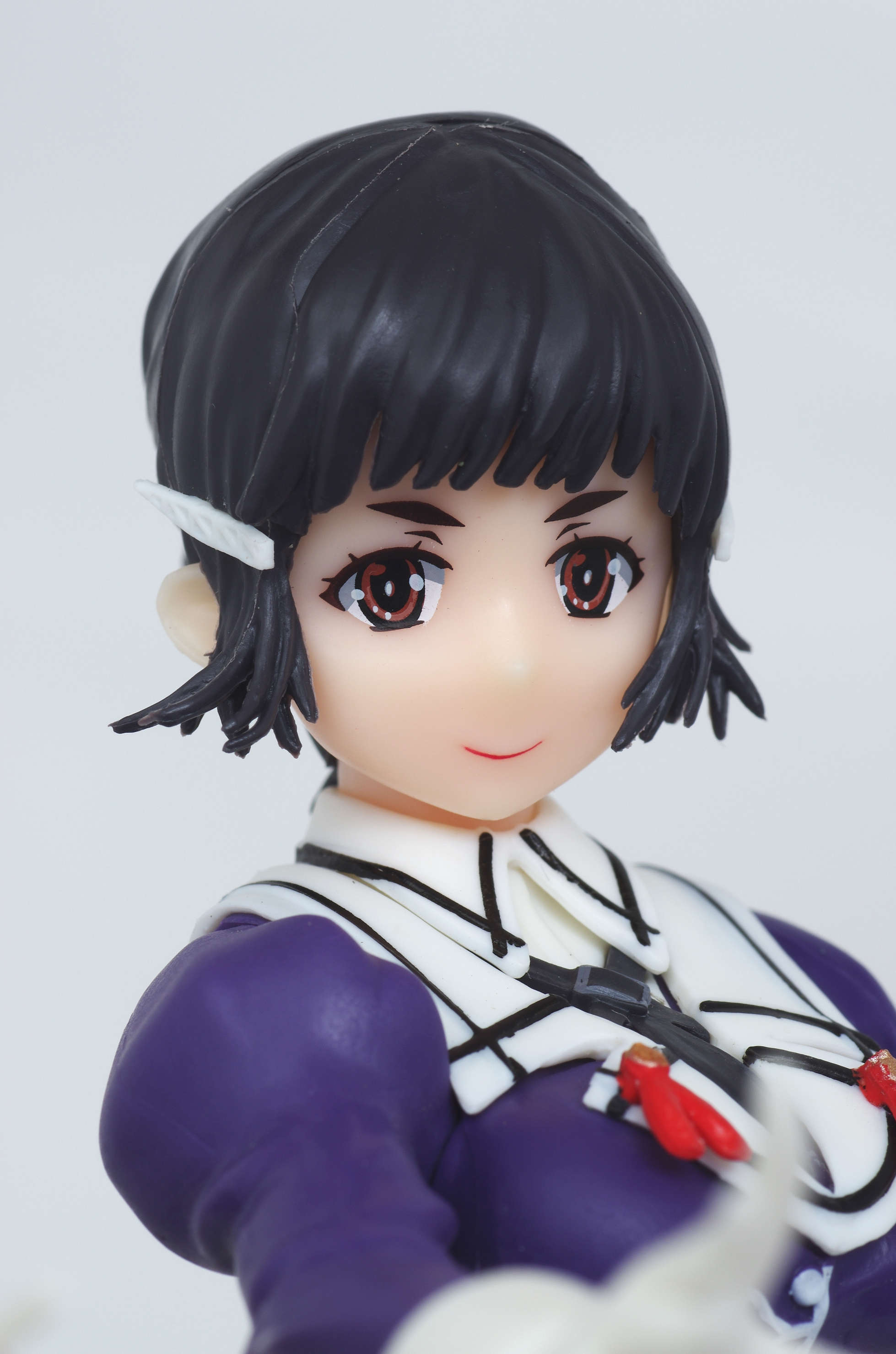 後ろでお団子にまとめた黒髪(両サイドの髪留めがポイント)