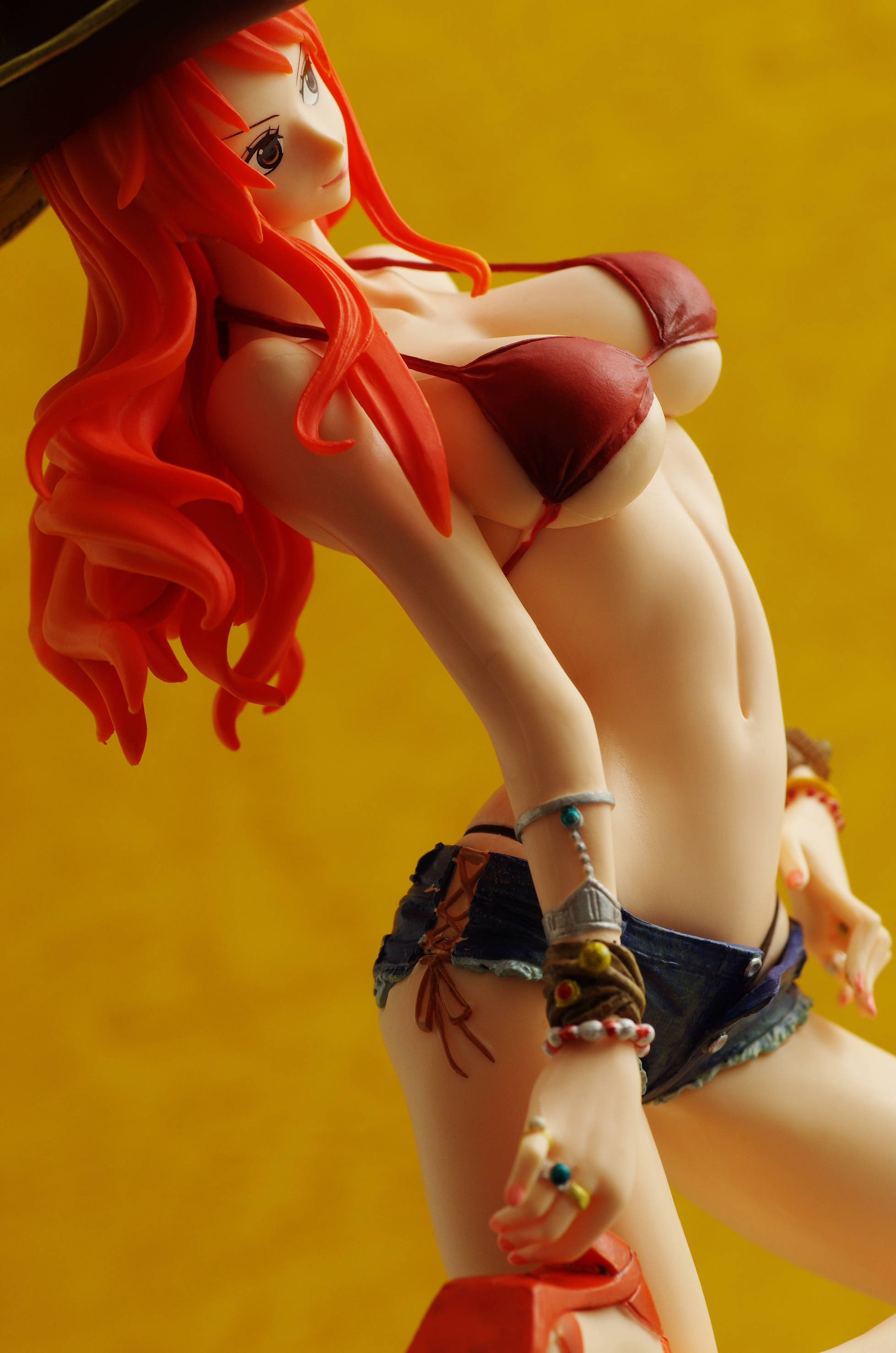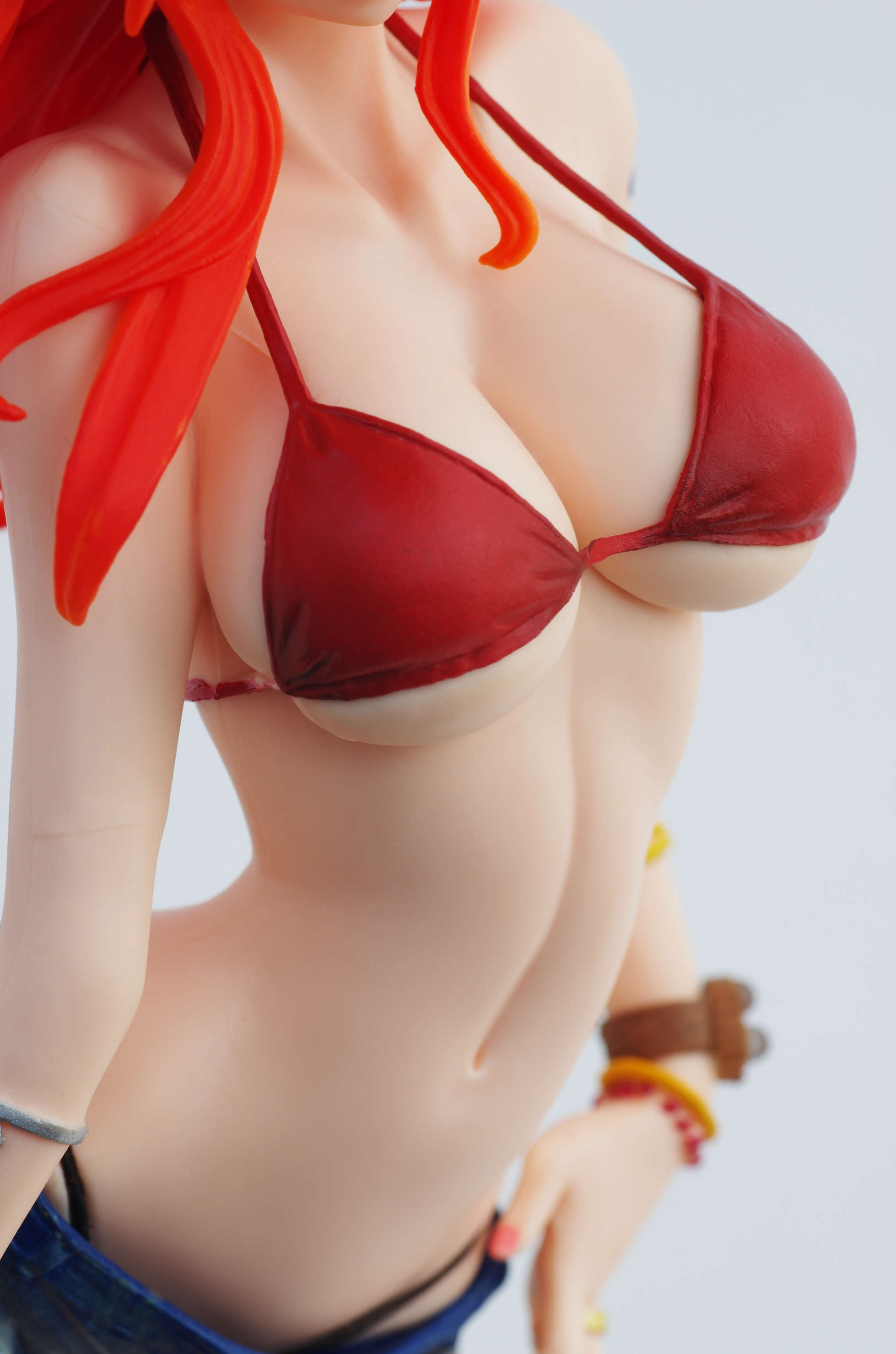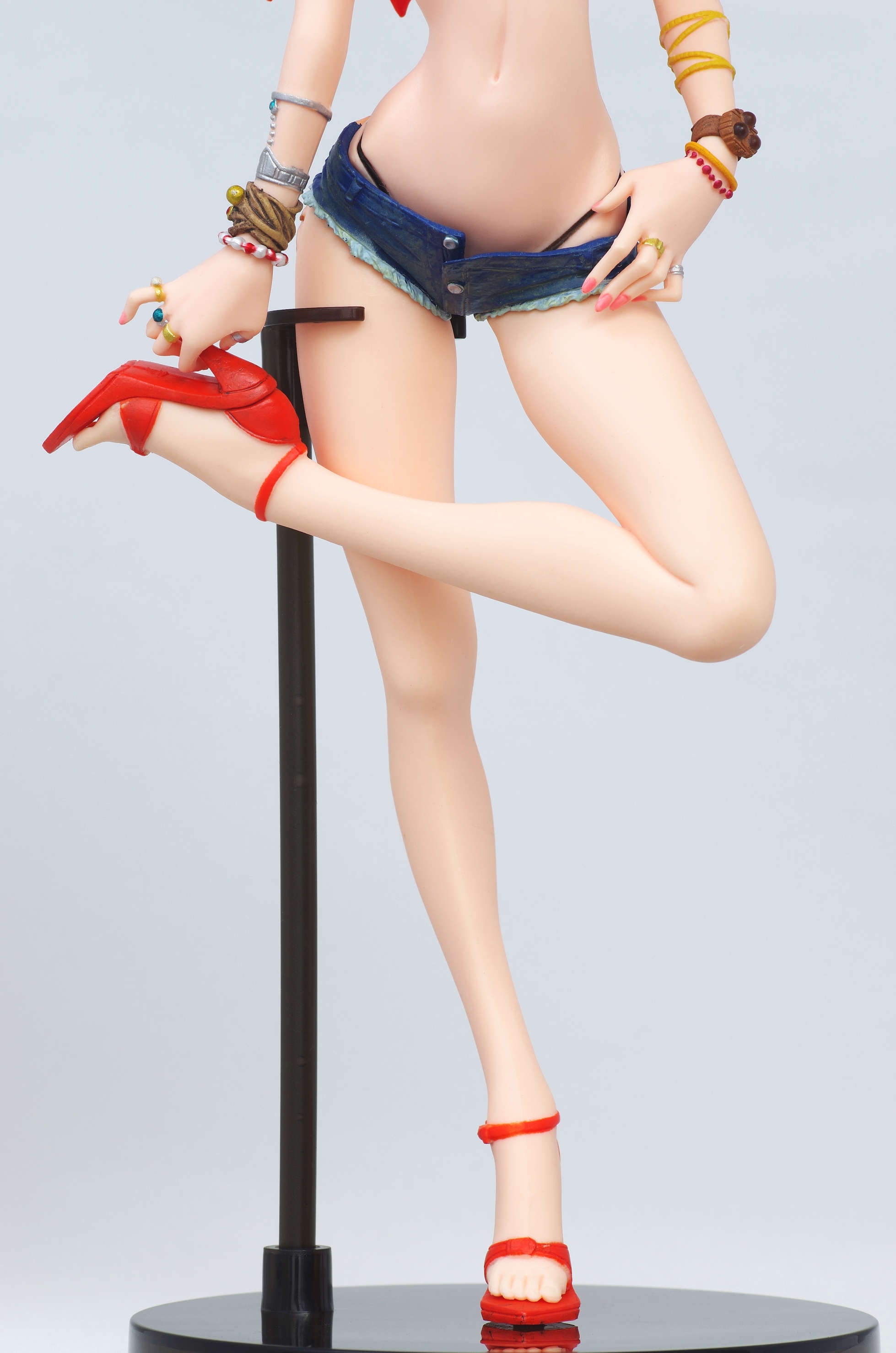 赤いビキニにデニムのショートパンツ(デニム裾の糸がほつれてる造形がすばら!)