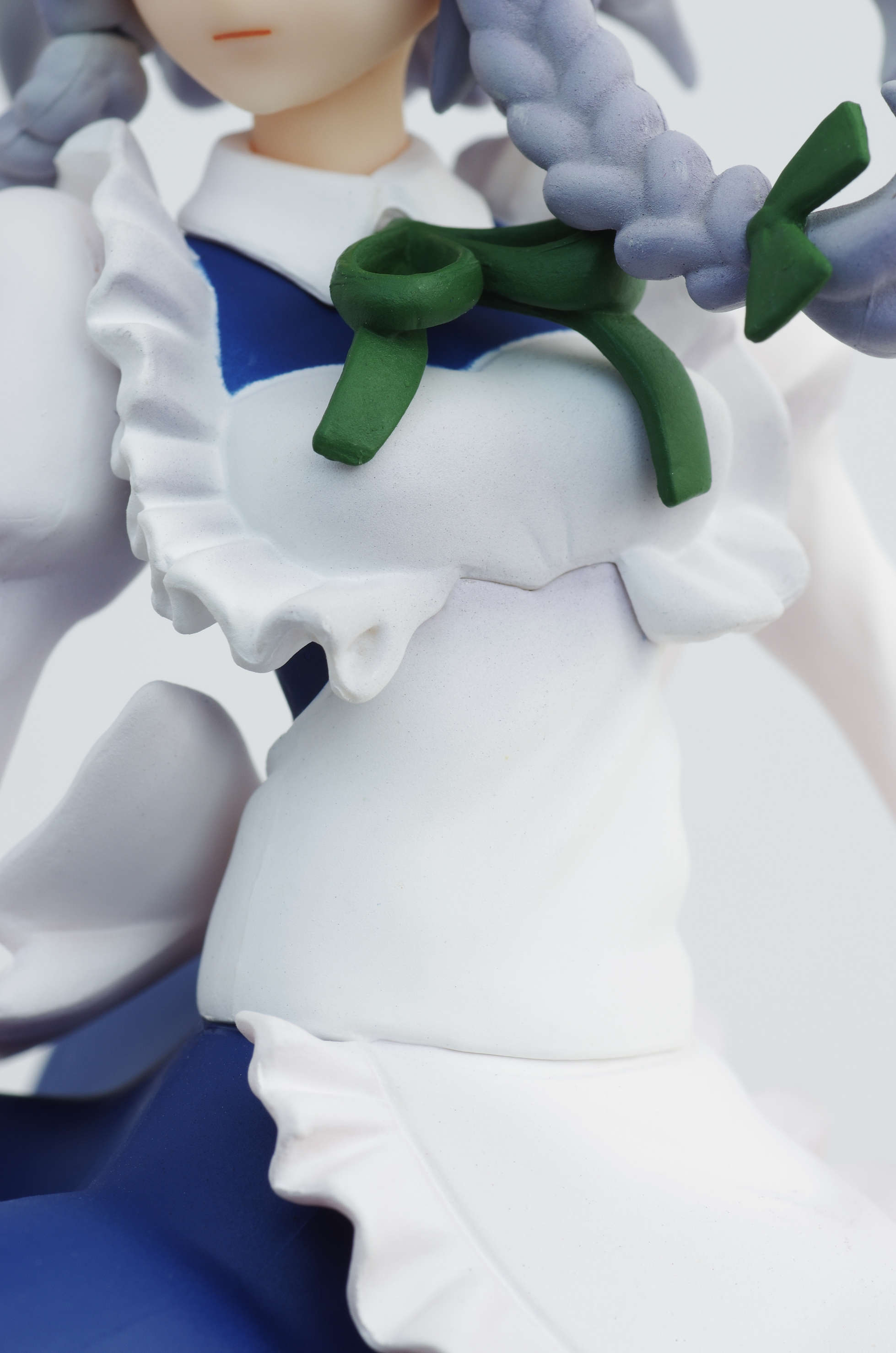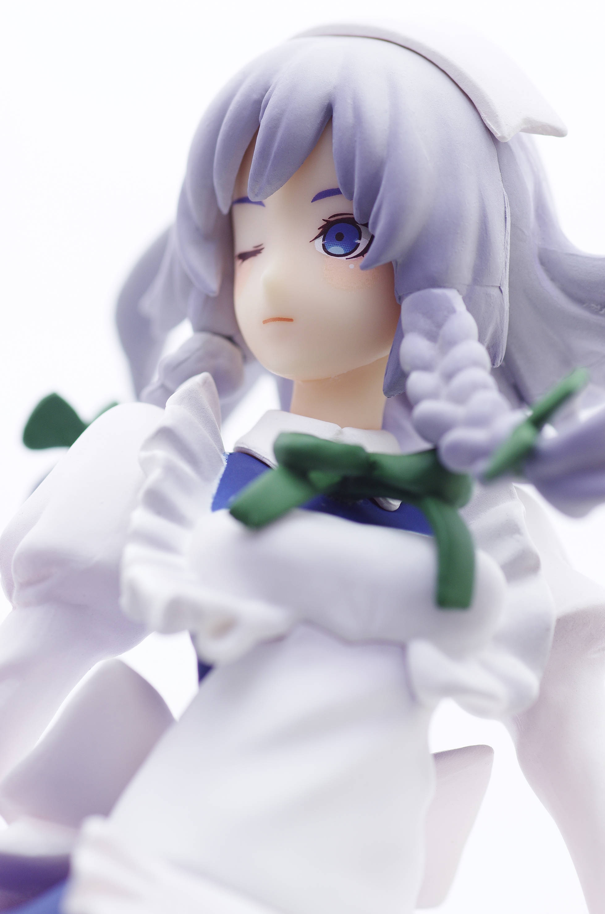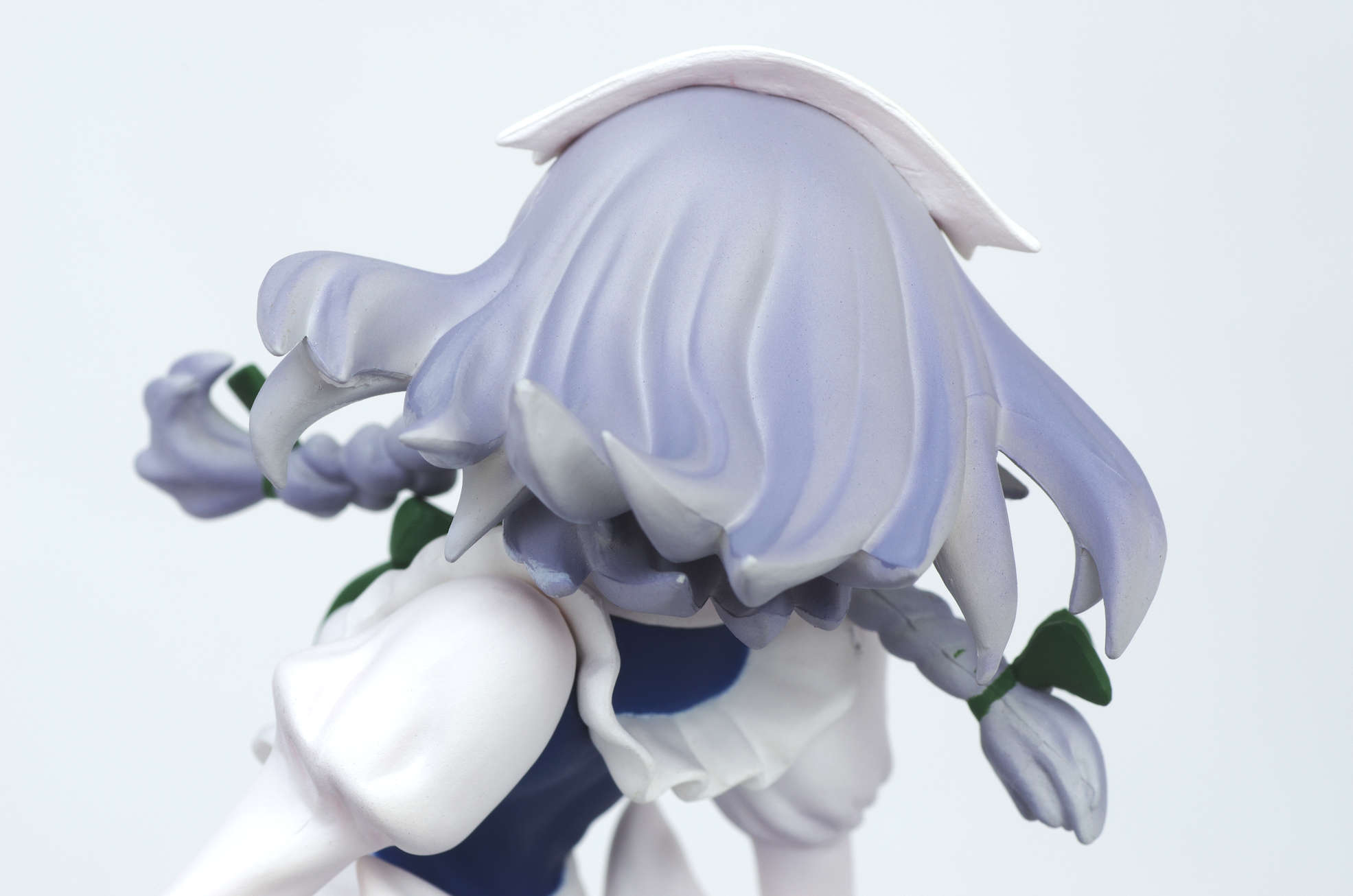 グラデーション塗装もされたグレーっぽい薄紫色の髪でおさげ(頭にはヘッドドレス)