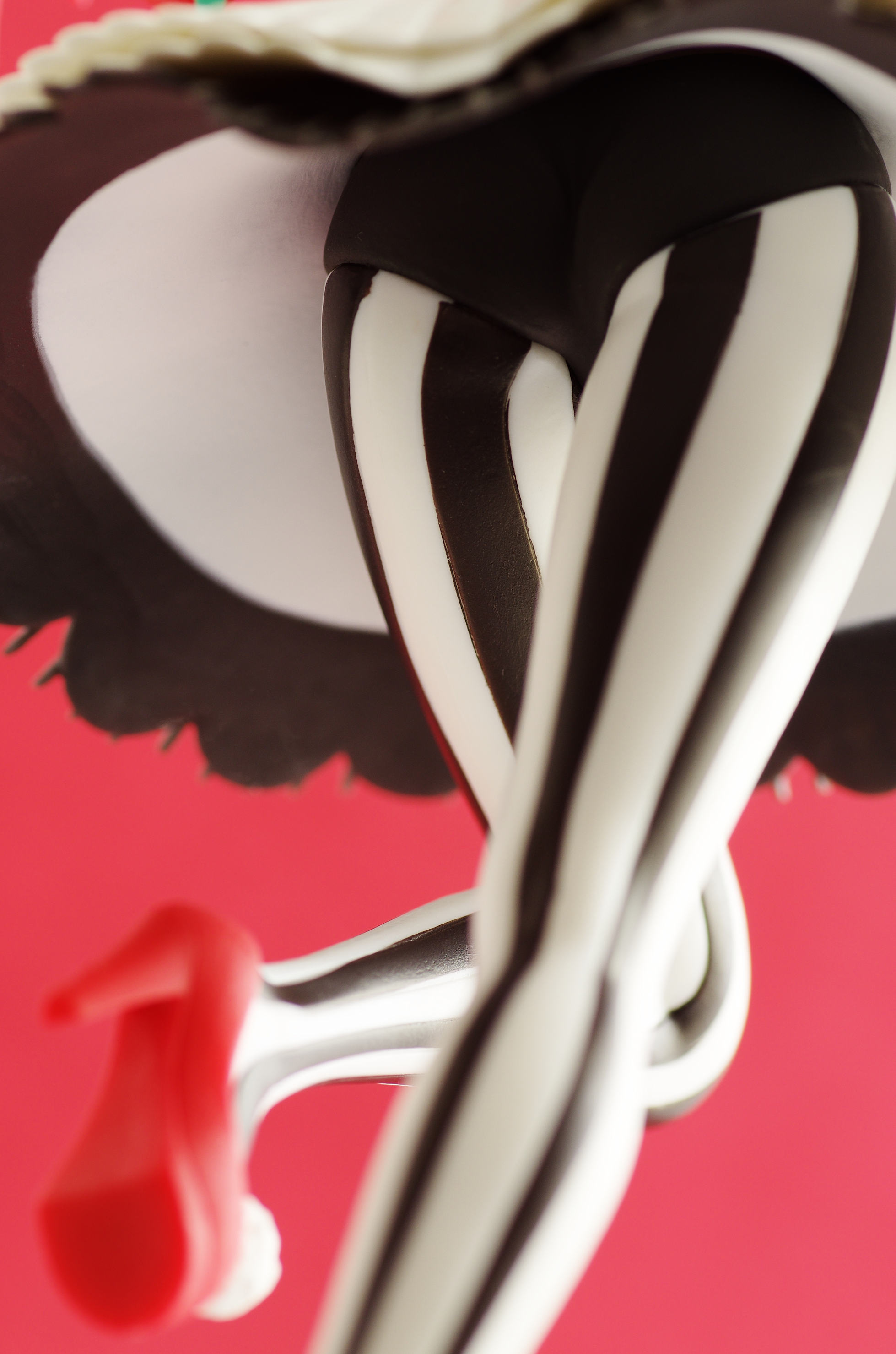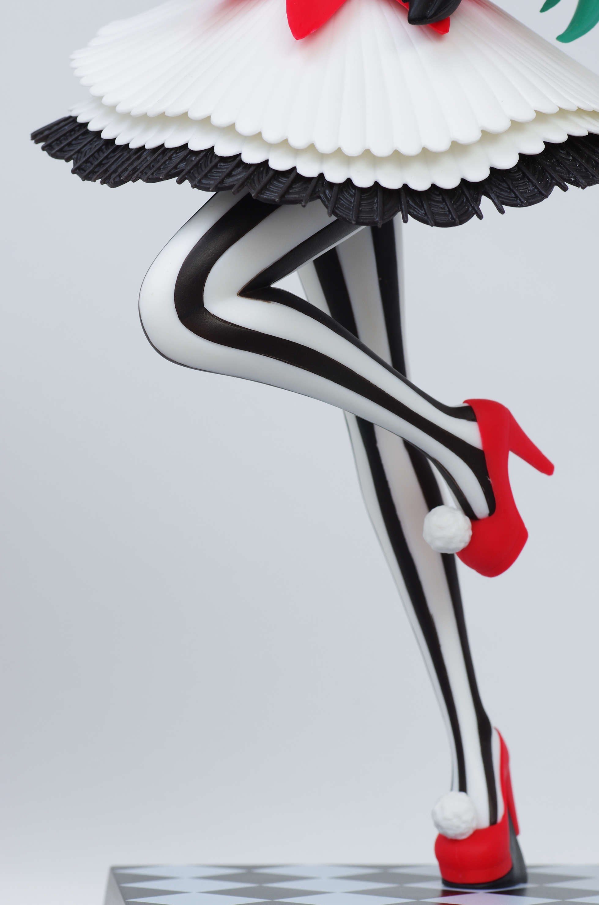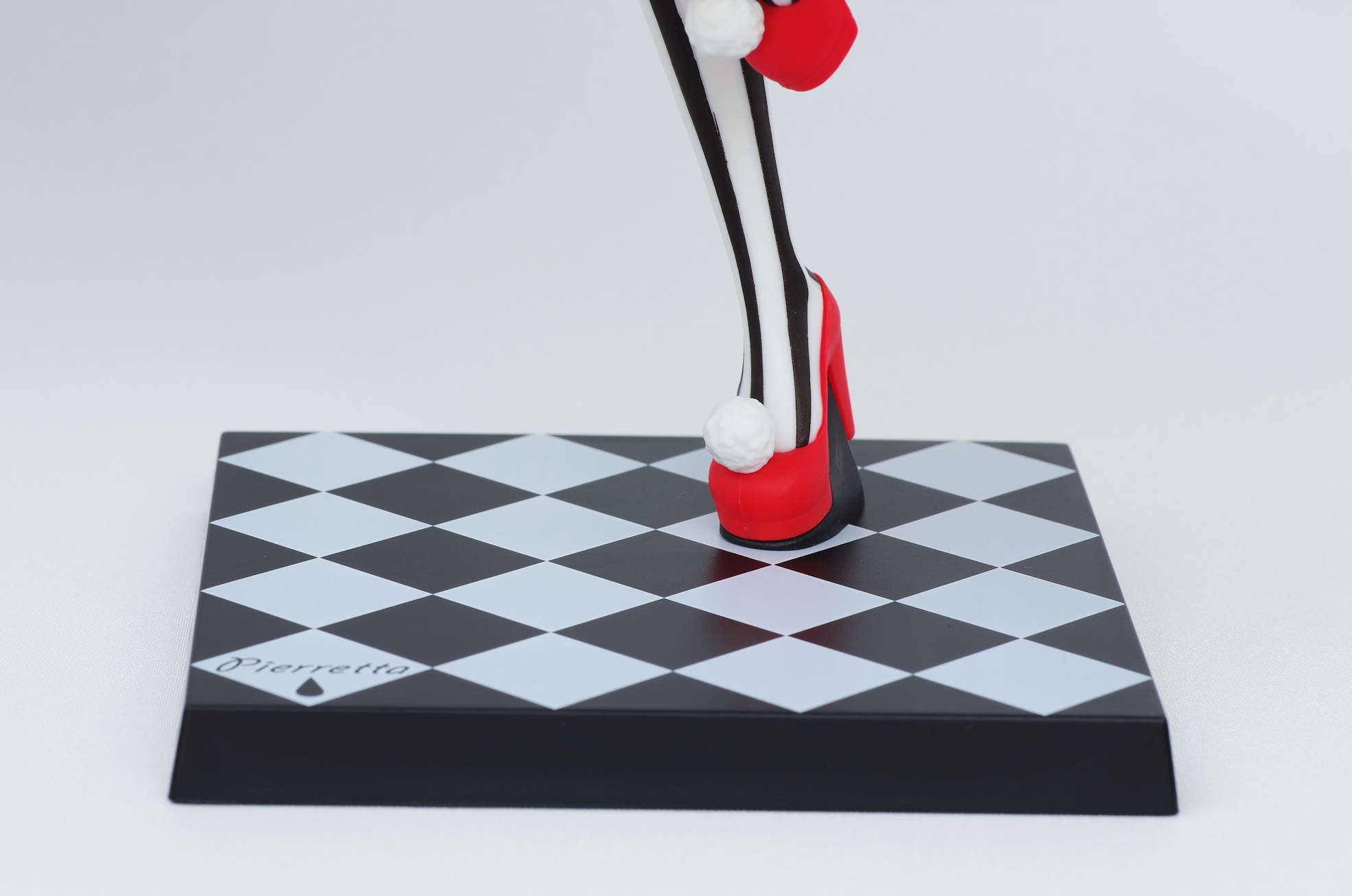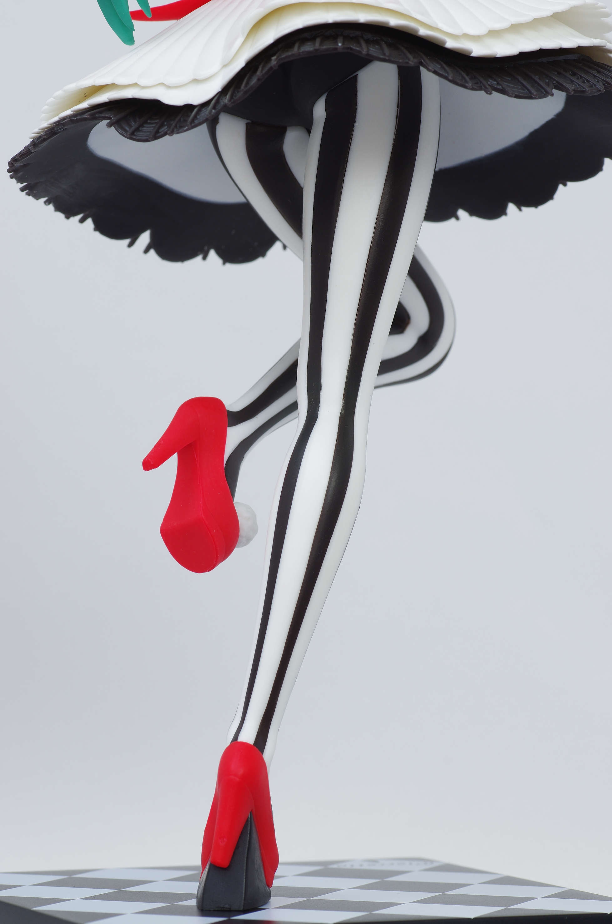 そして足元の赤いヒールにチェック柄の台座