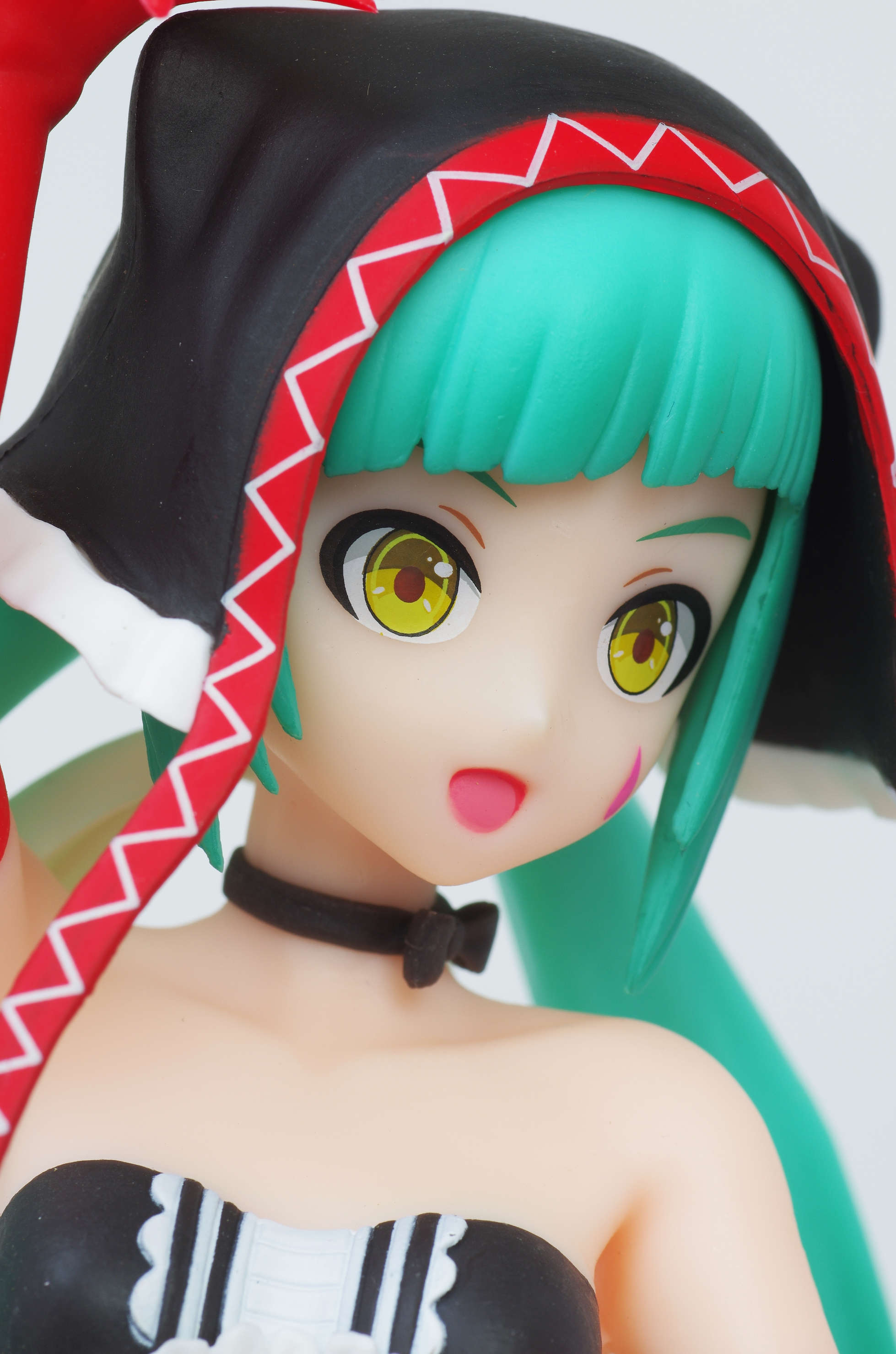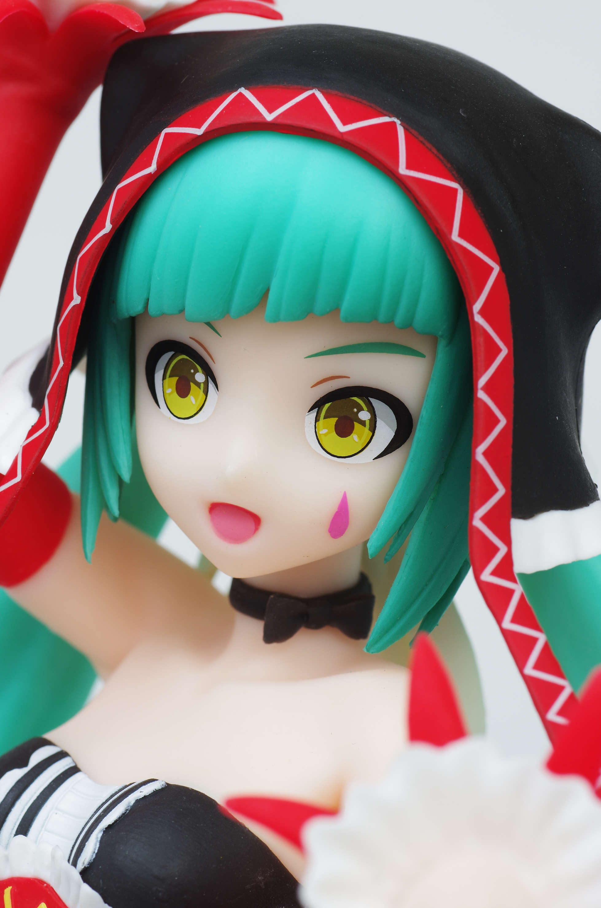垂れ下がる赤い紐が印象的な猫耳フードにツインテール(後ろで留めた白いリボンが良いアクセントに)