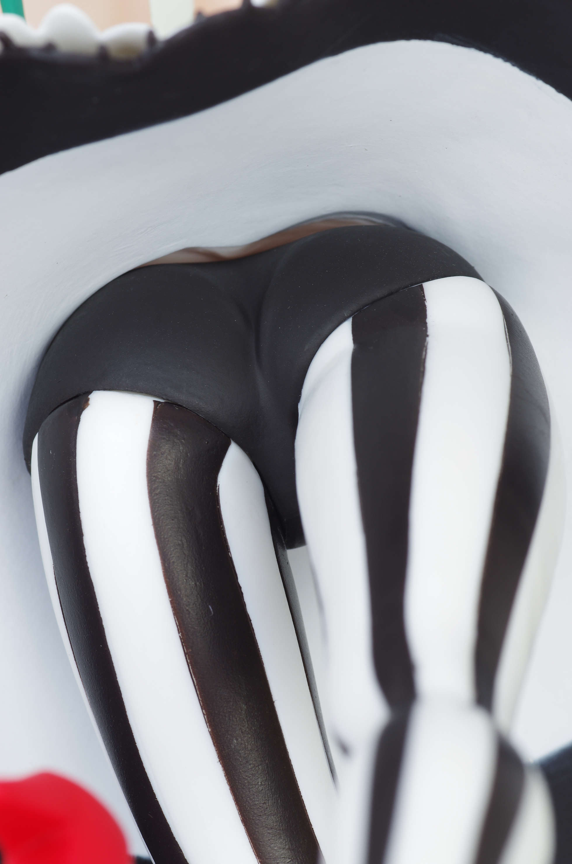 片足立ちの足には白黒の縦縞ストッキング
