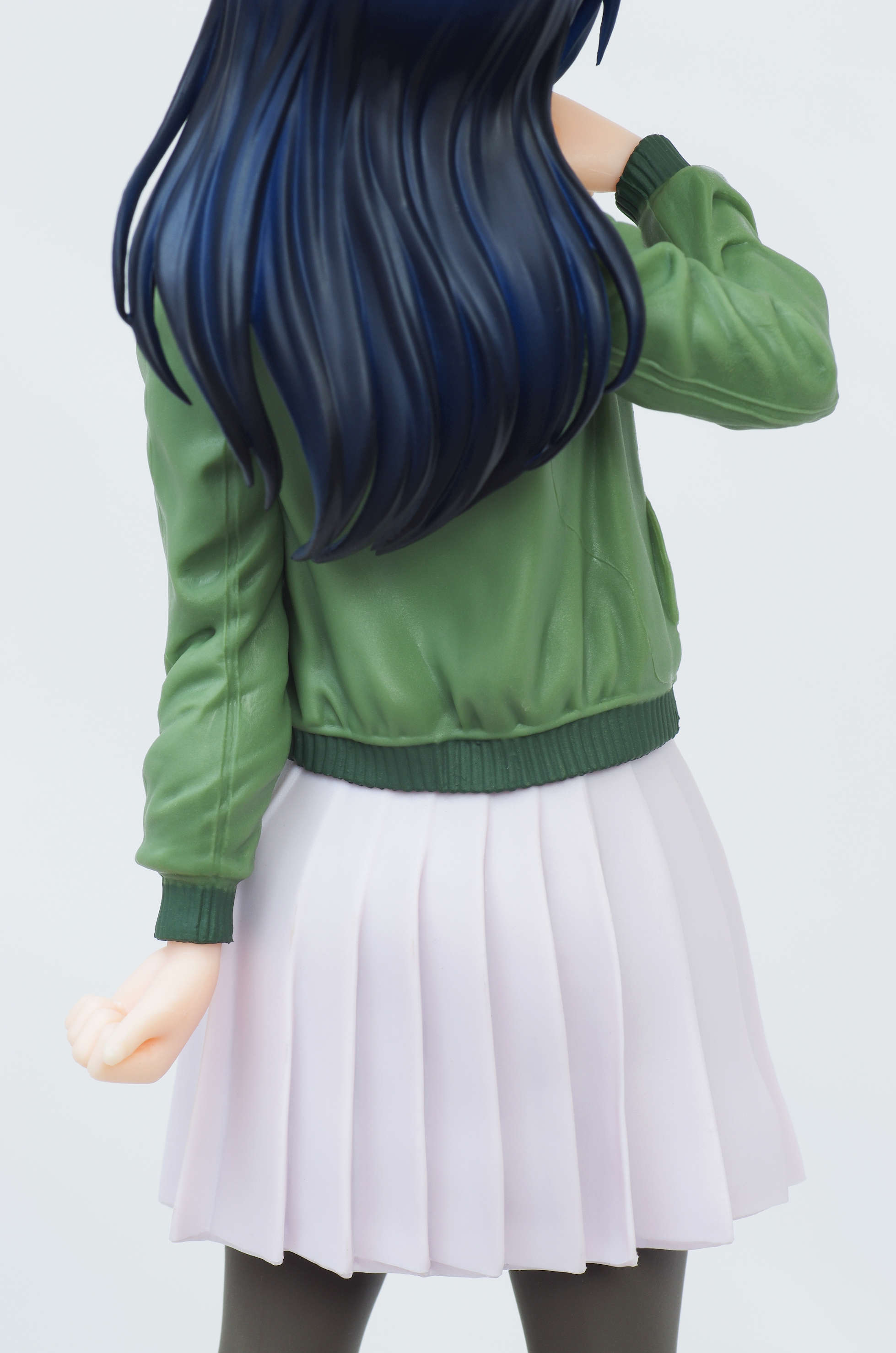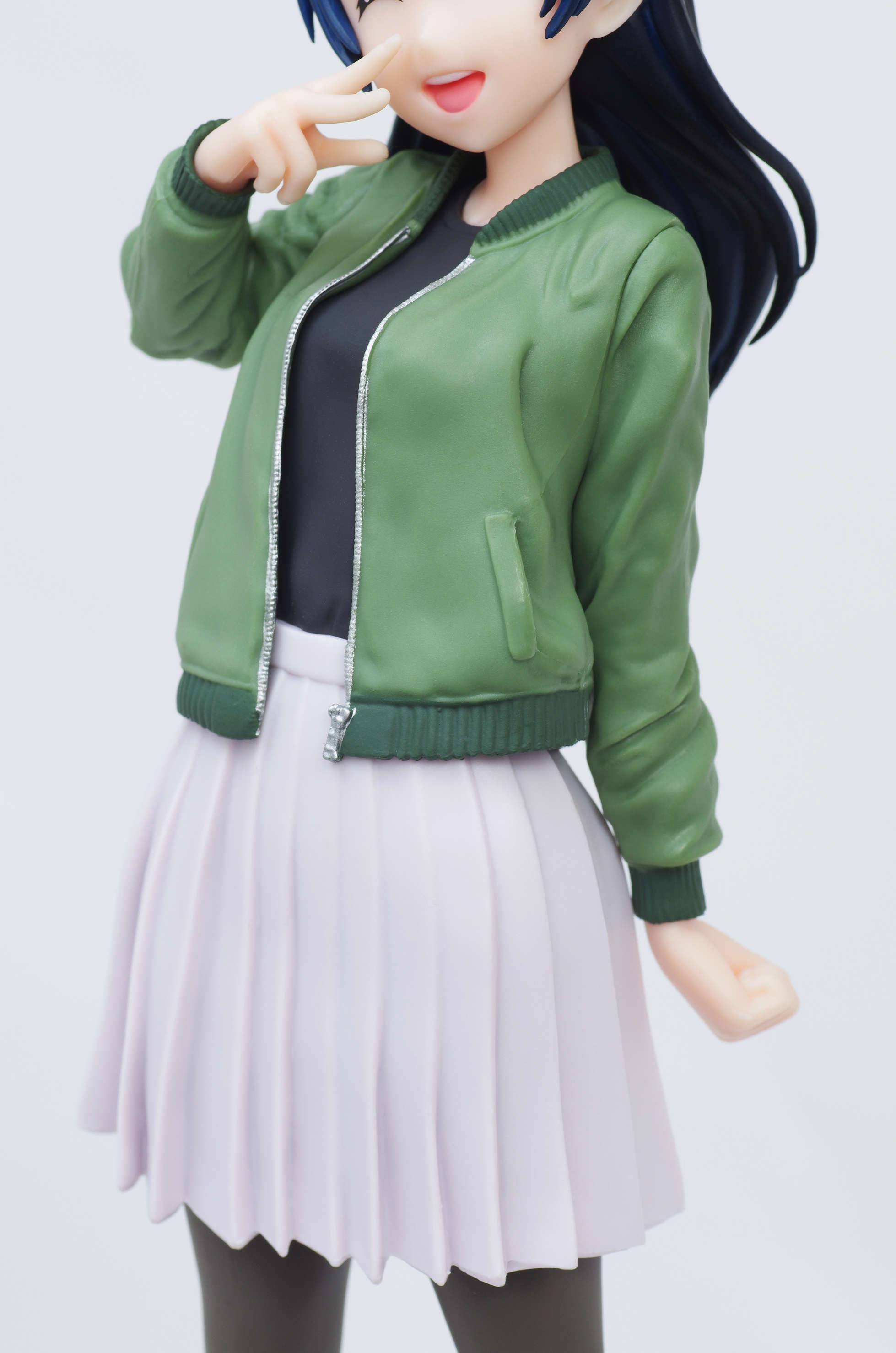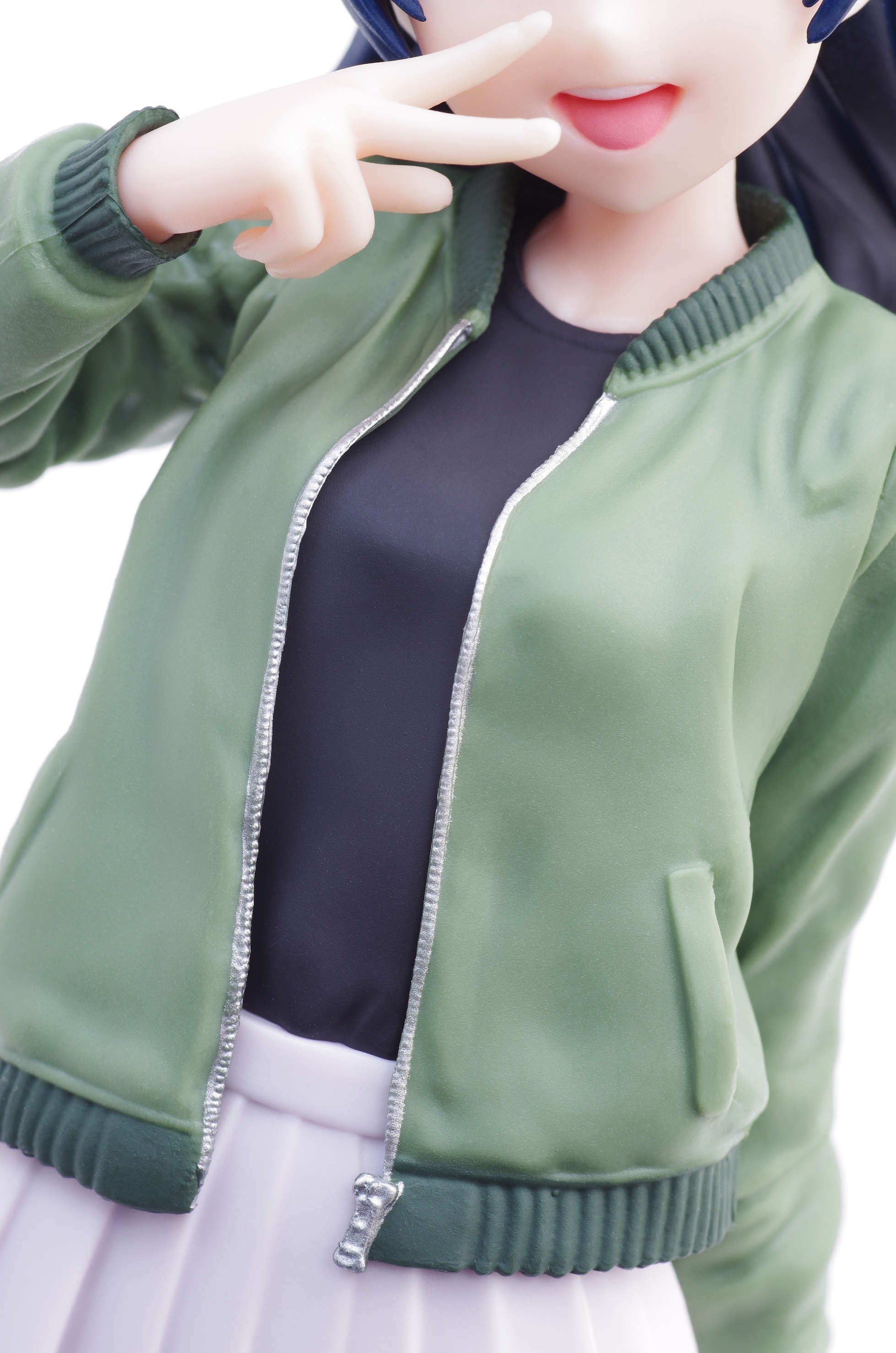 緑色のフライトジャケットに黒のカットソー下は少しグレーがかったスカート(シワの表現がすばら☆)